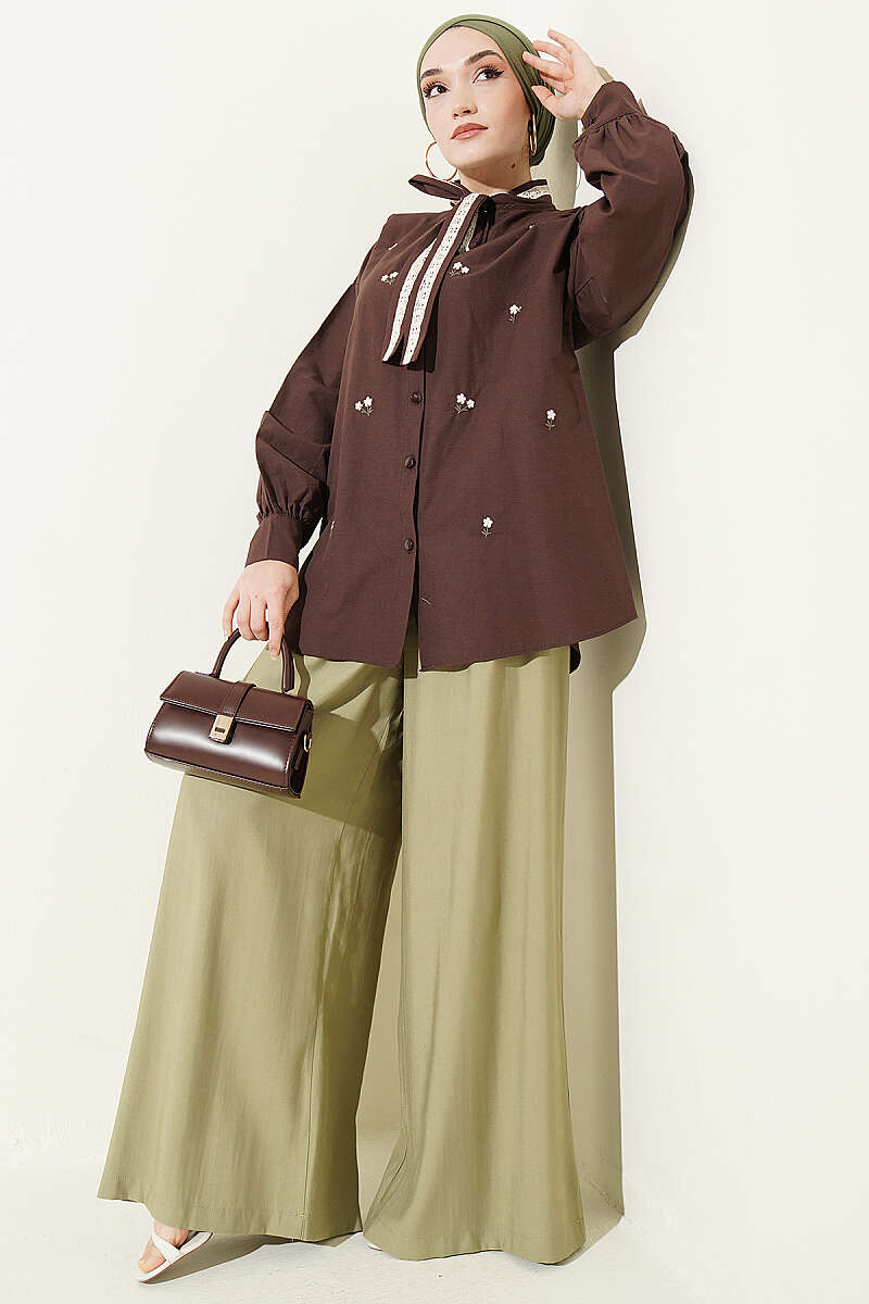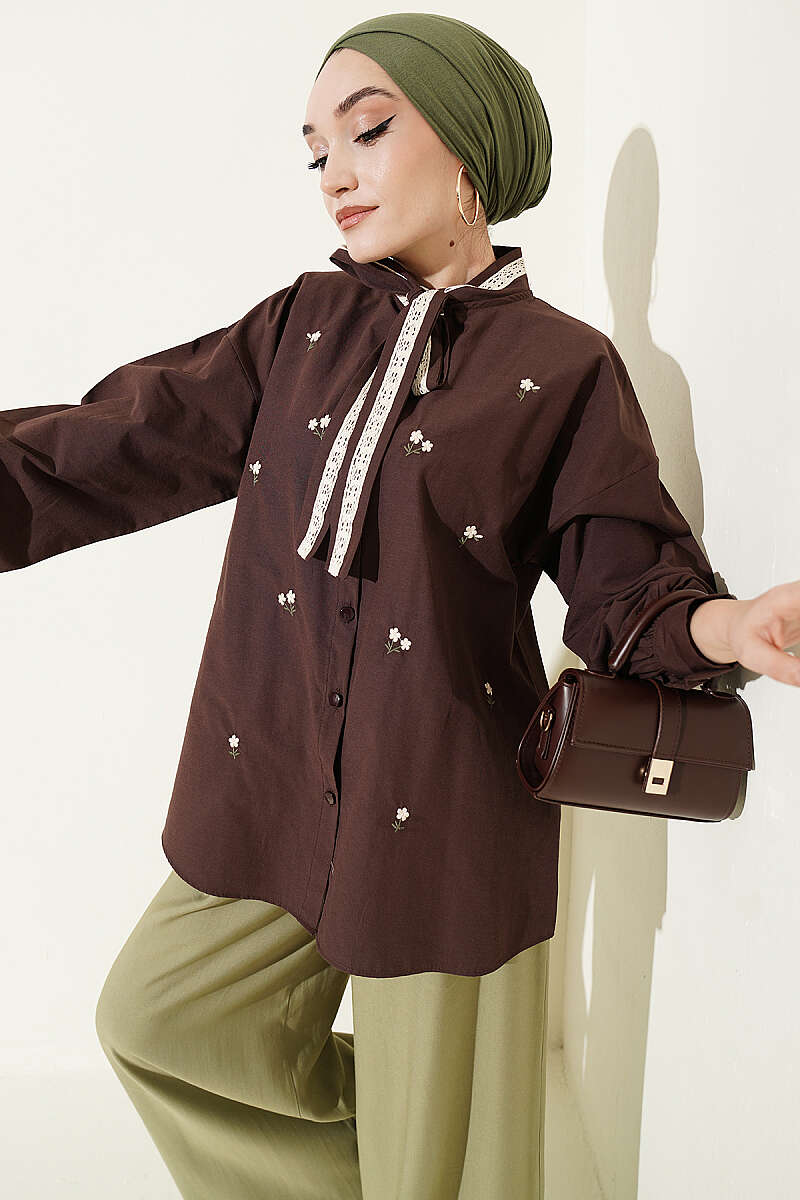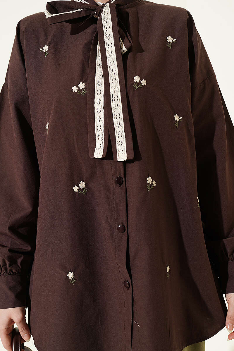 Çiçek Nakışlı Yakası Bağlamalı Gömlek Kahve