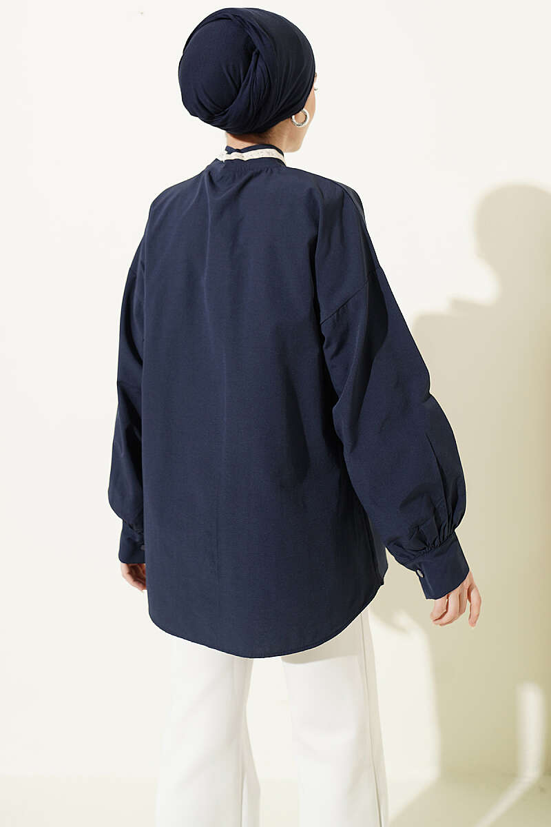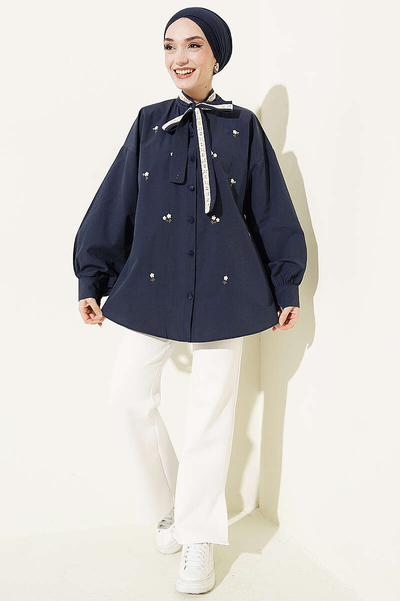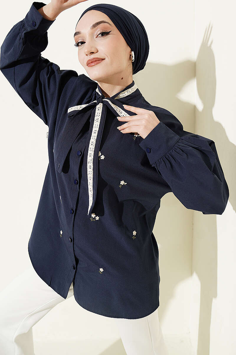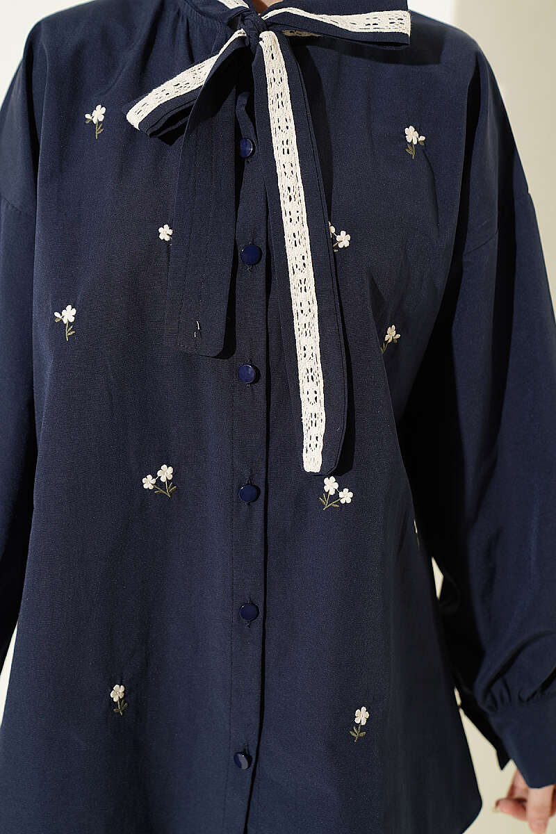 Çiçek Nakışlı Yakası Bağlamalı Gömlek Lacivert
