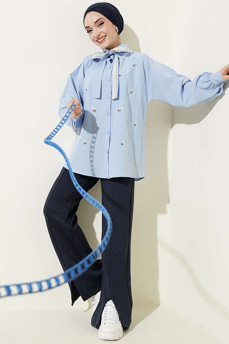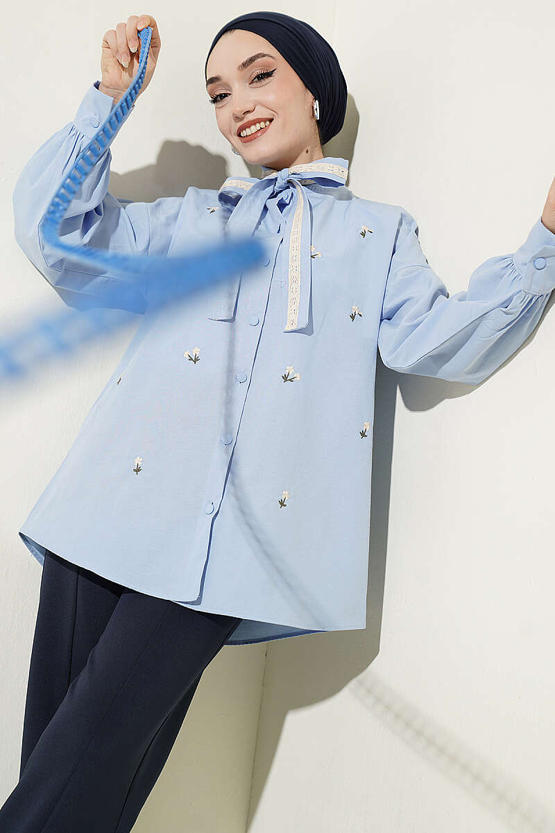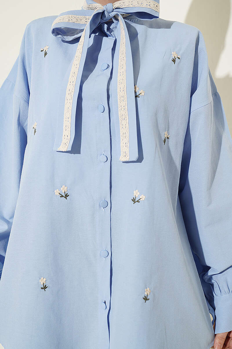 Çiçek Nakışlı Yakası Bağlamalı Gömlek Mavi
