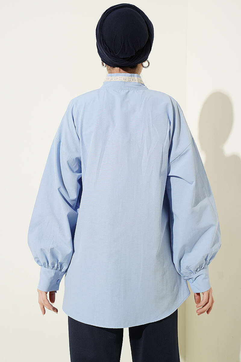 İnce Çizgili Güpür Detaylı Gömlek Mavi