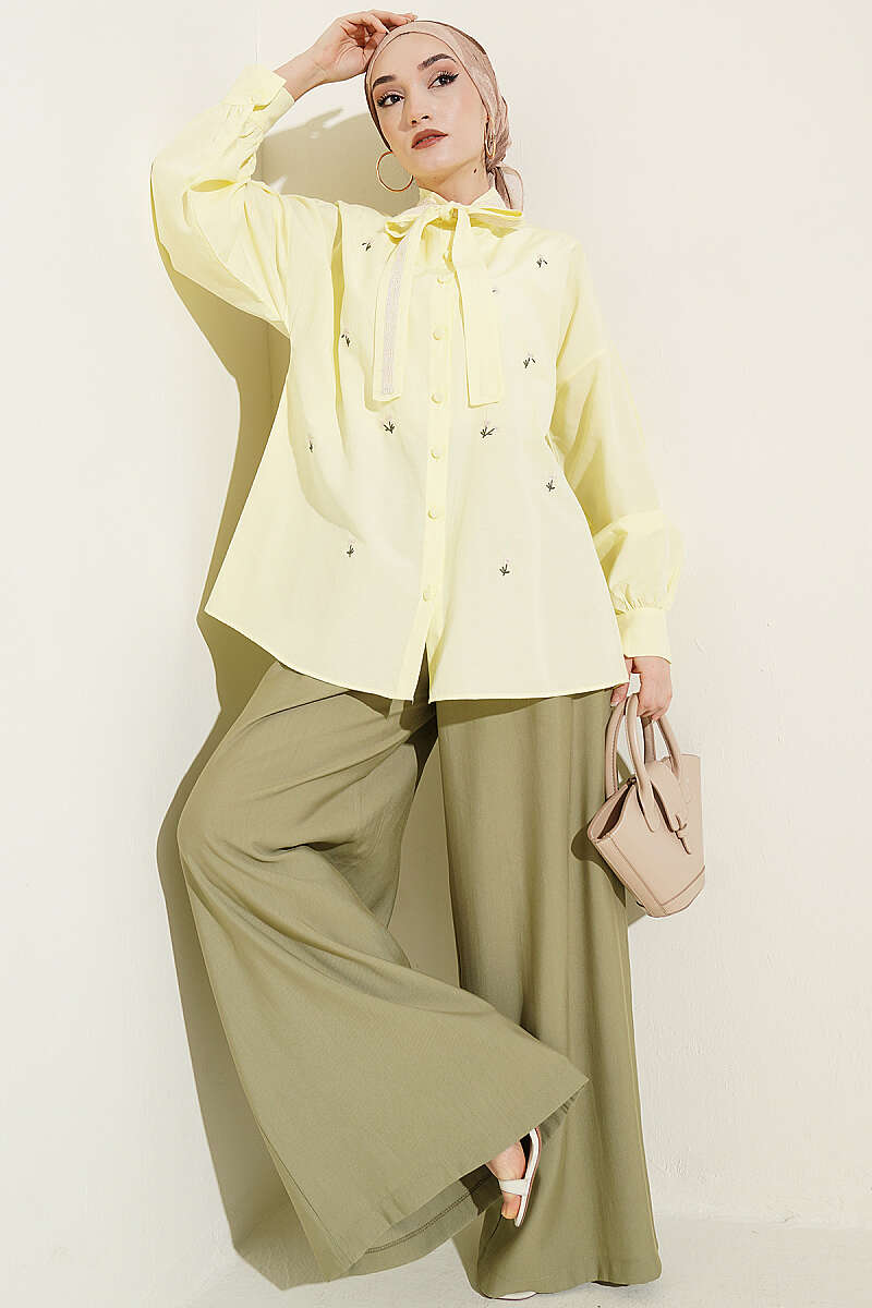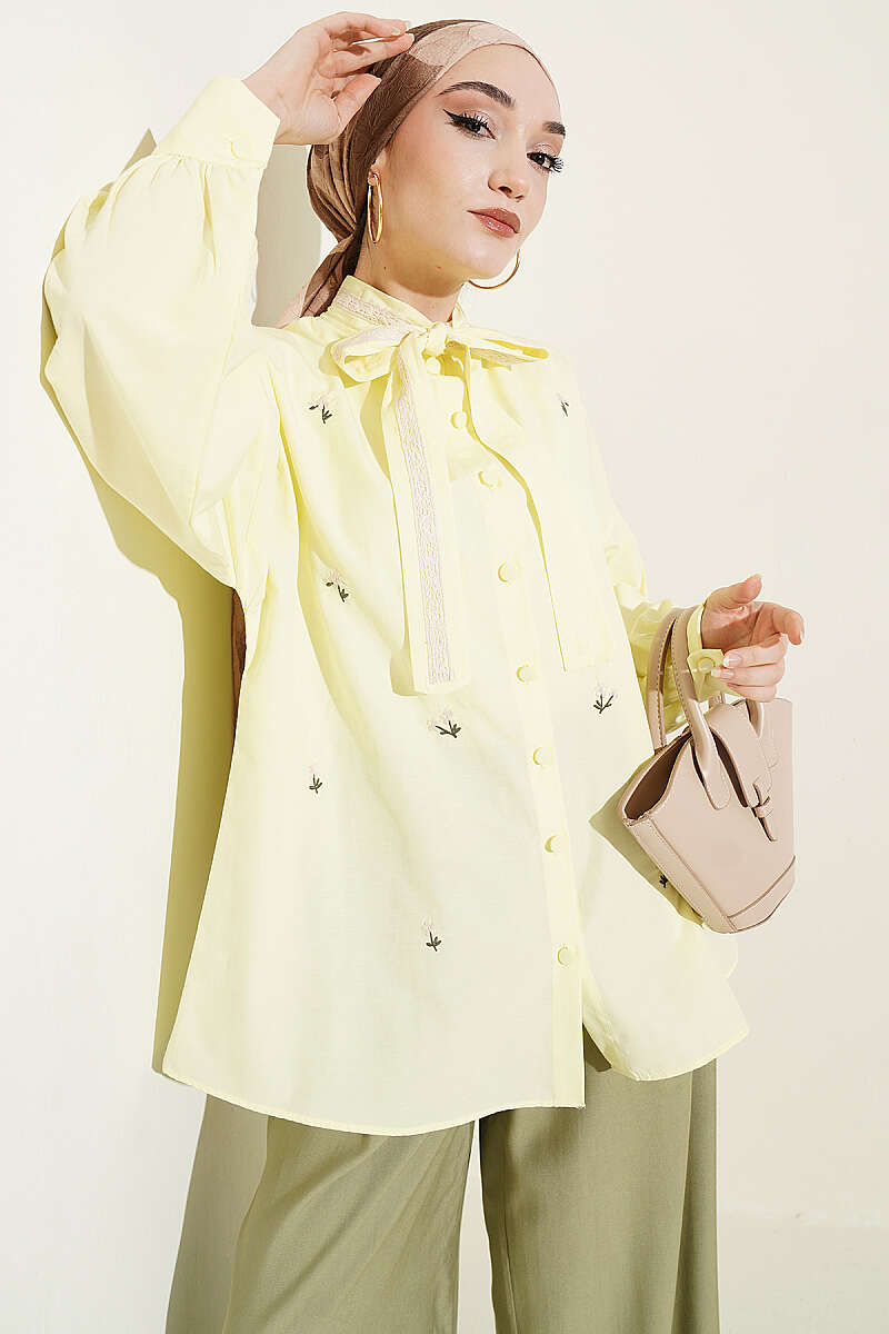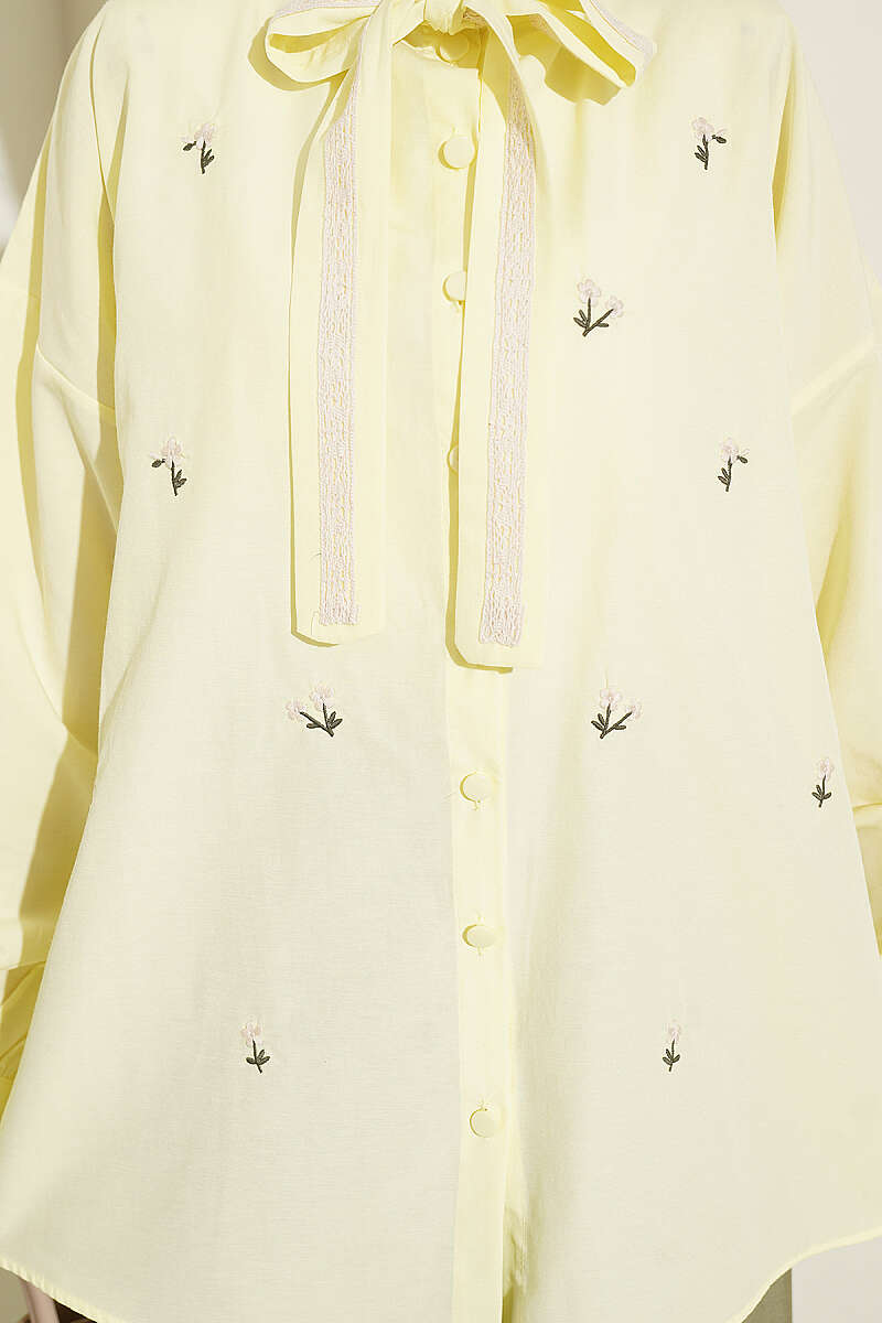 Çiçek Nakışlı Yakası Bağlamalı Gömlek Sarı