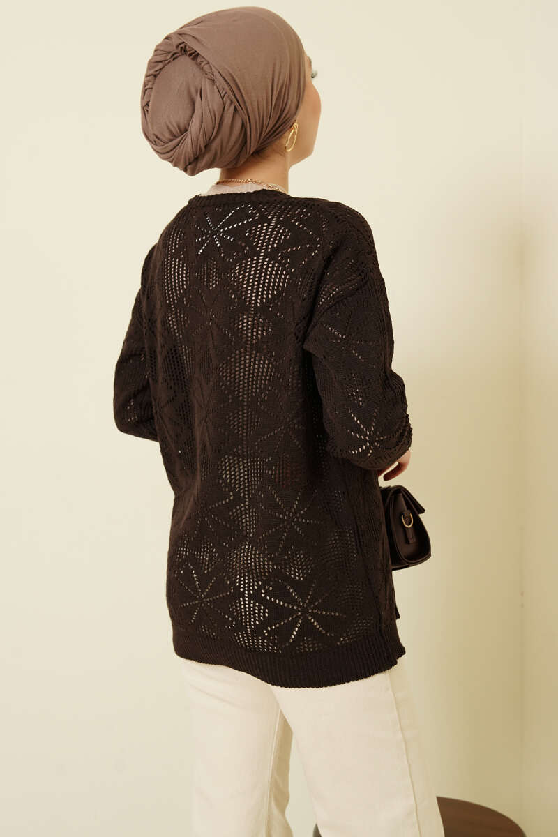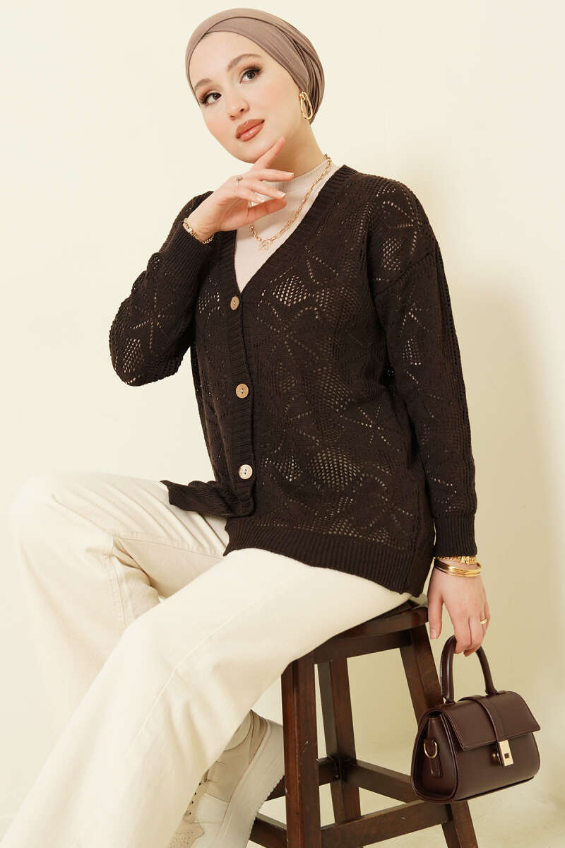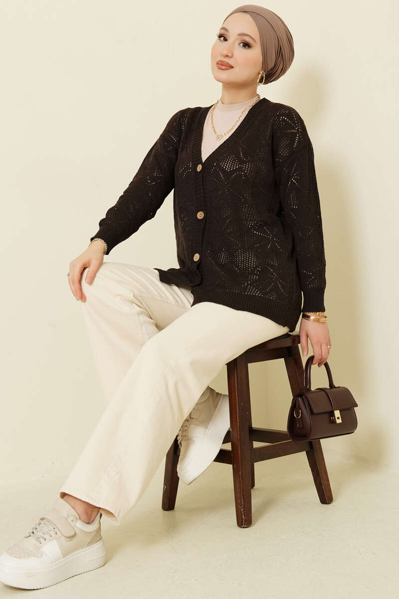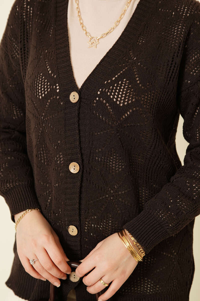 Çiçek Örgülü Düğmeli Triko Hırka Acı Kahve