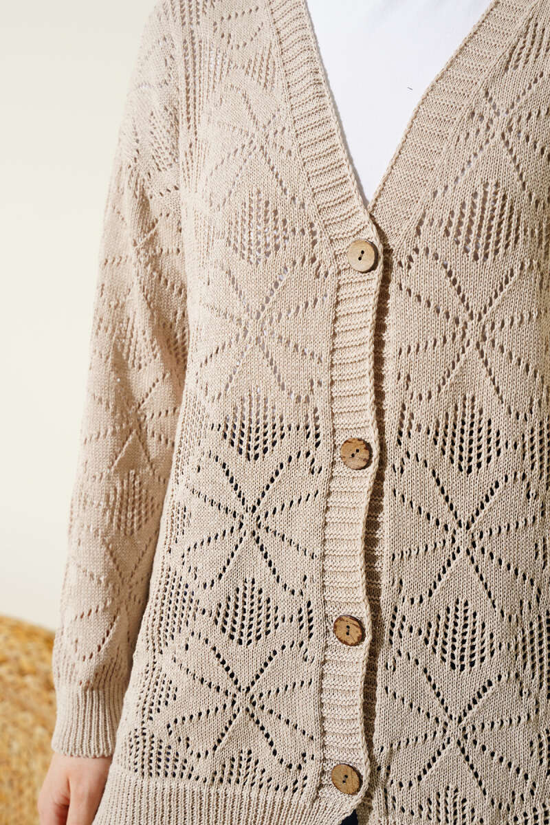 Çiçek Örgülü Düğmeli Triko Hırka Bej