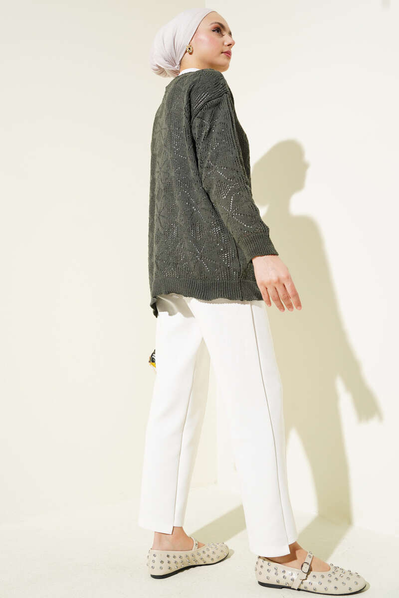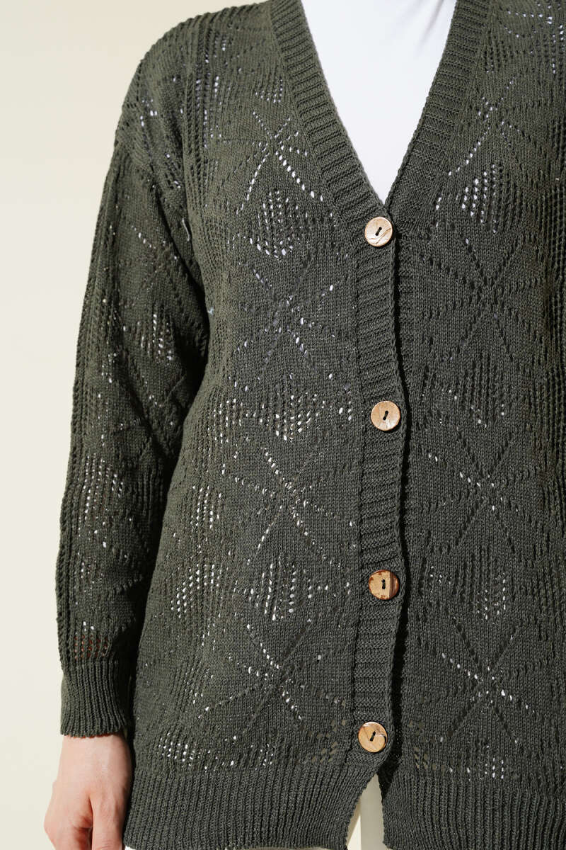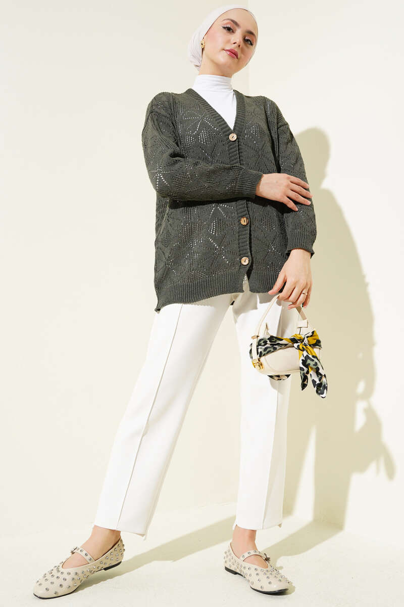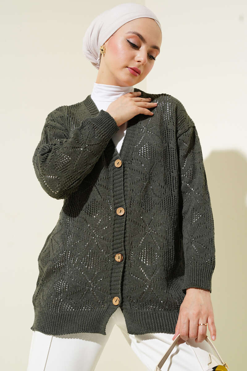 Çiçek Örgülü Düğmeli Triko Hırka Haki