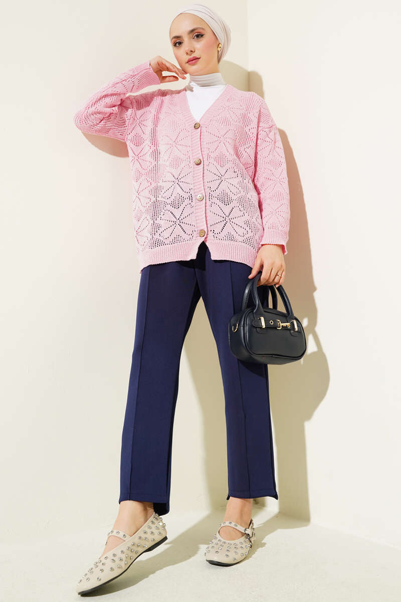 Çiçek Nakışlı Düğmeli Merserize Hırka Lacivert