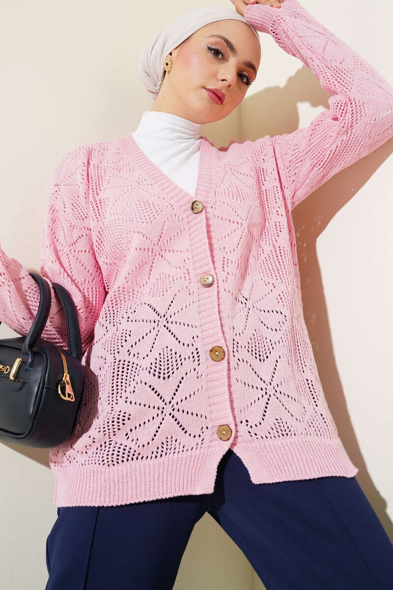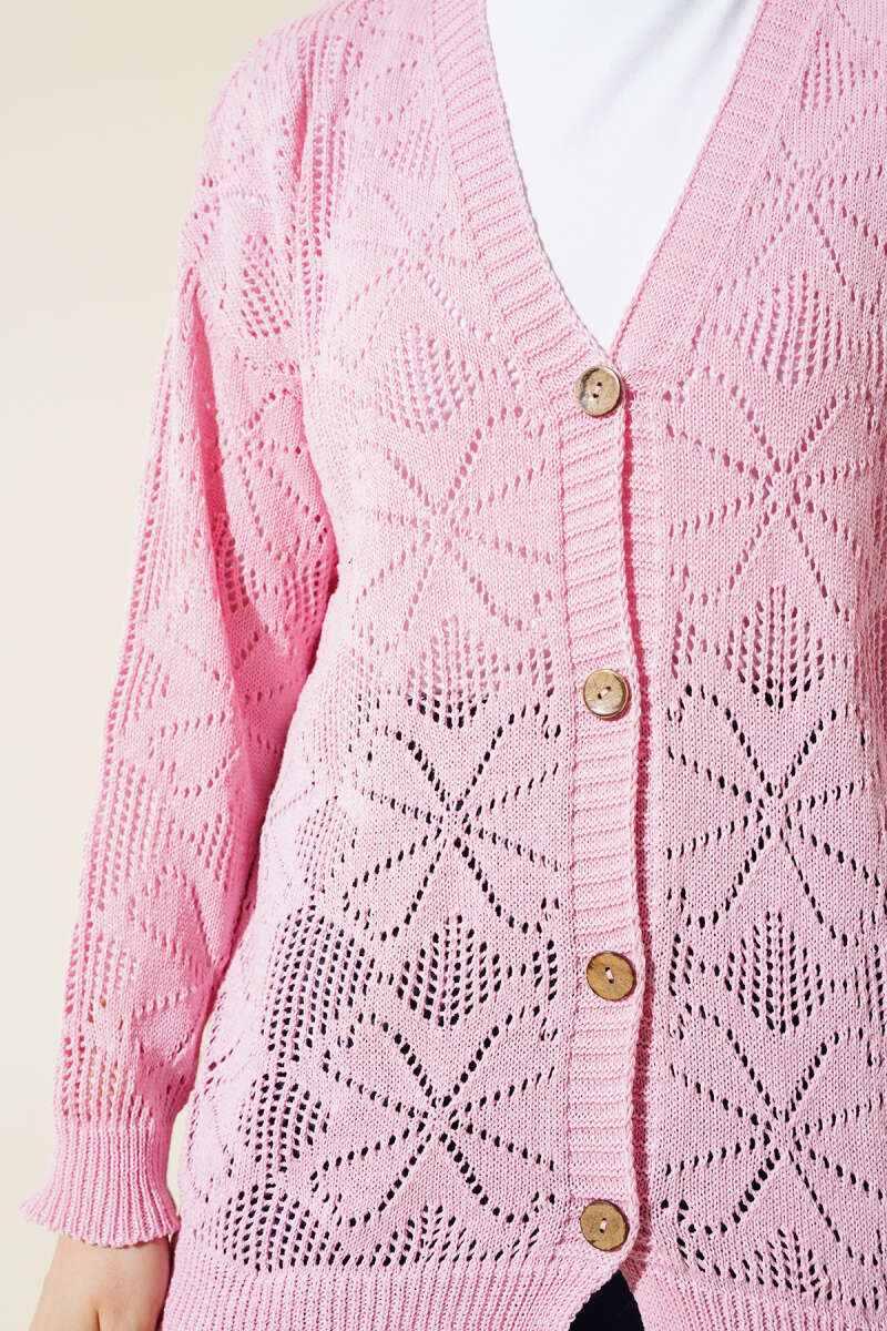 Çiçek Nakışlı Düğmeli Merserize Hırka Vizon