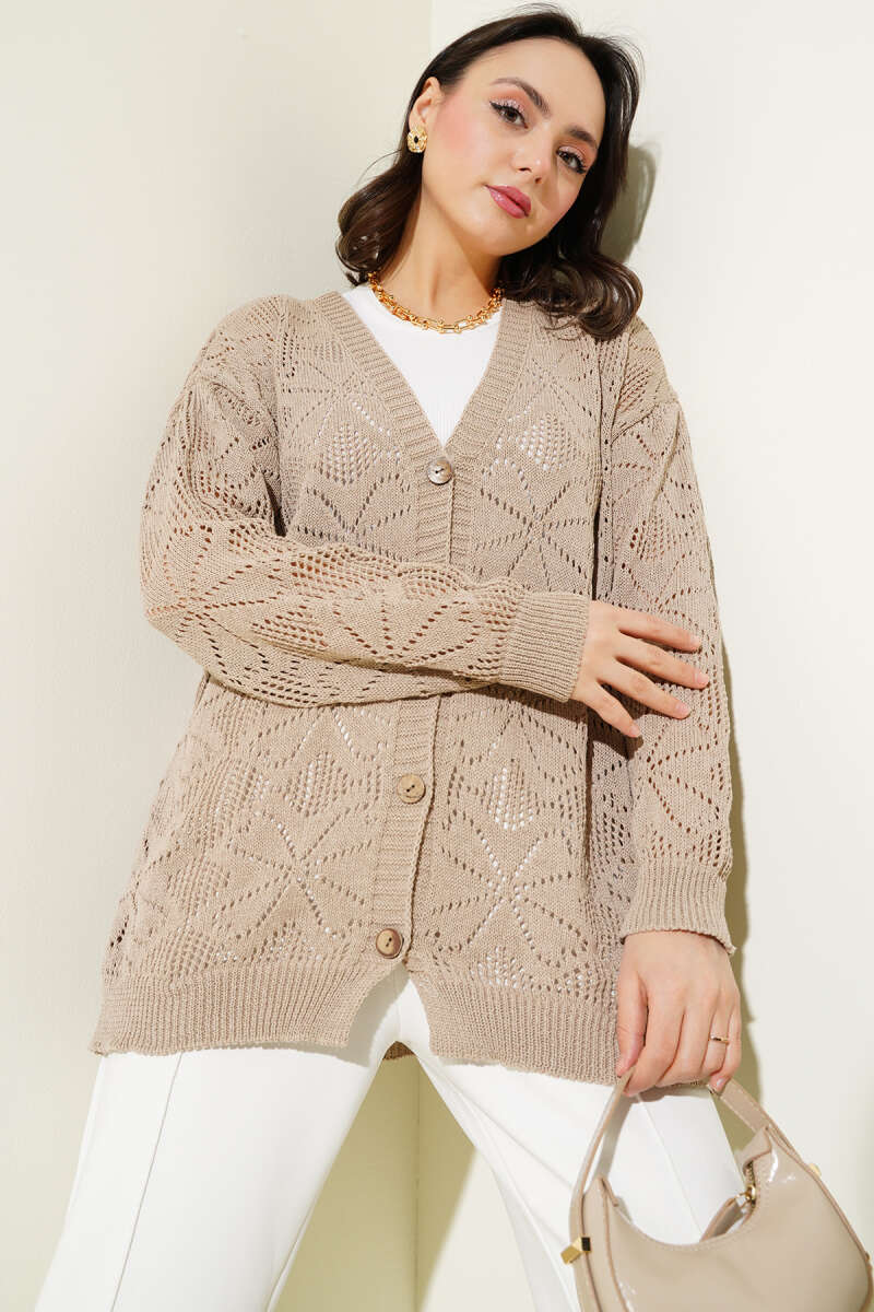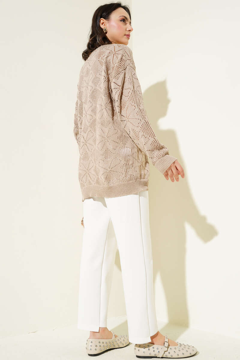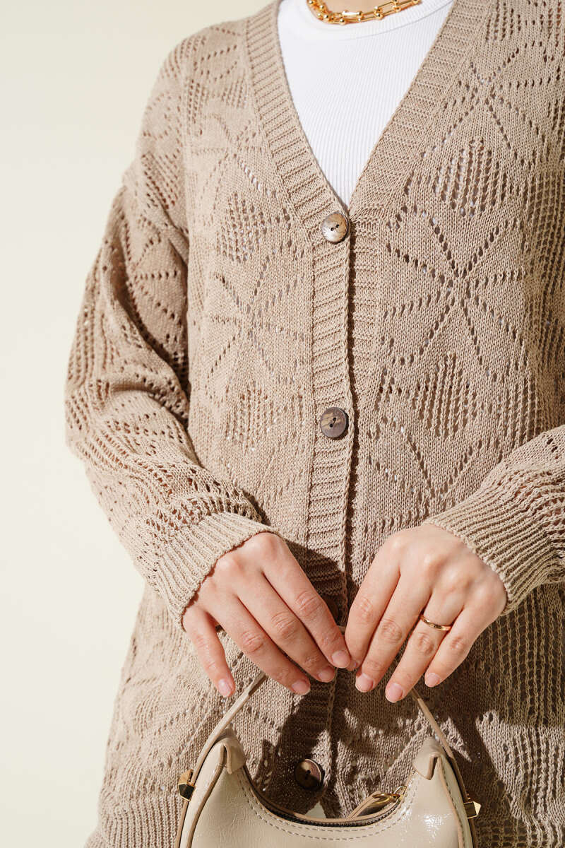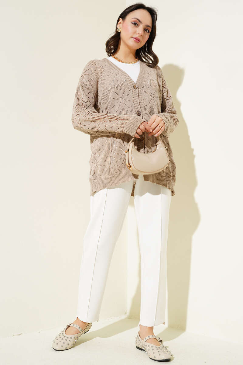 Çiçek Örgülü Düğmeli Triko Hırka Vizon