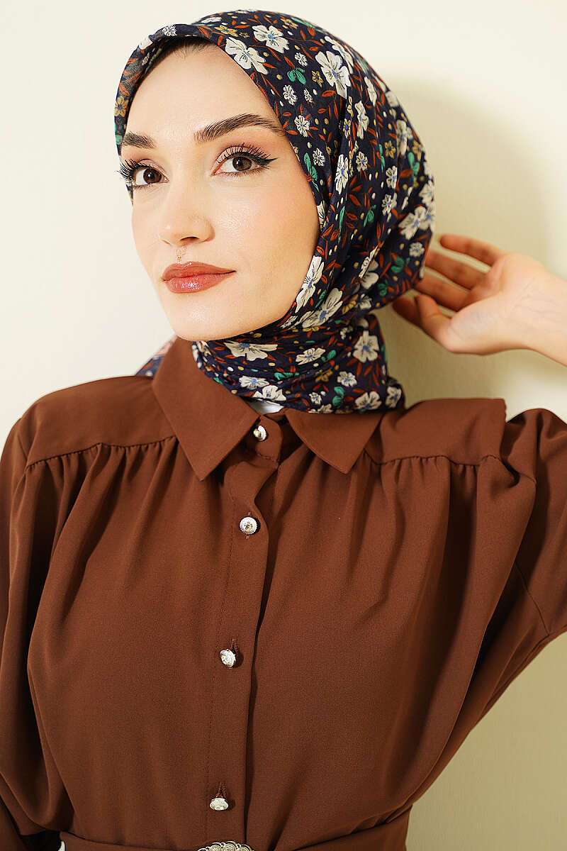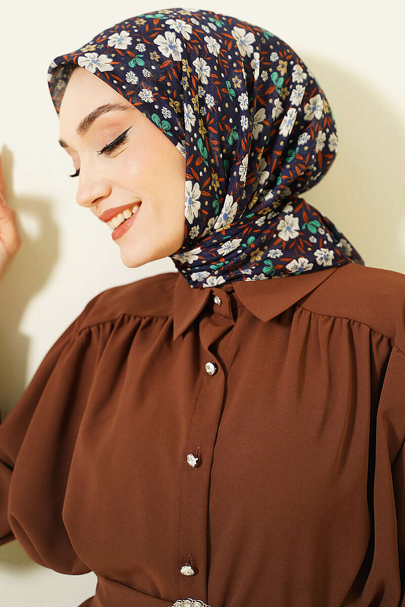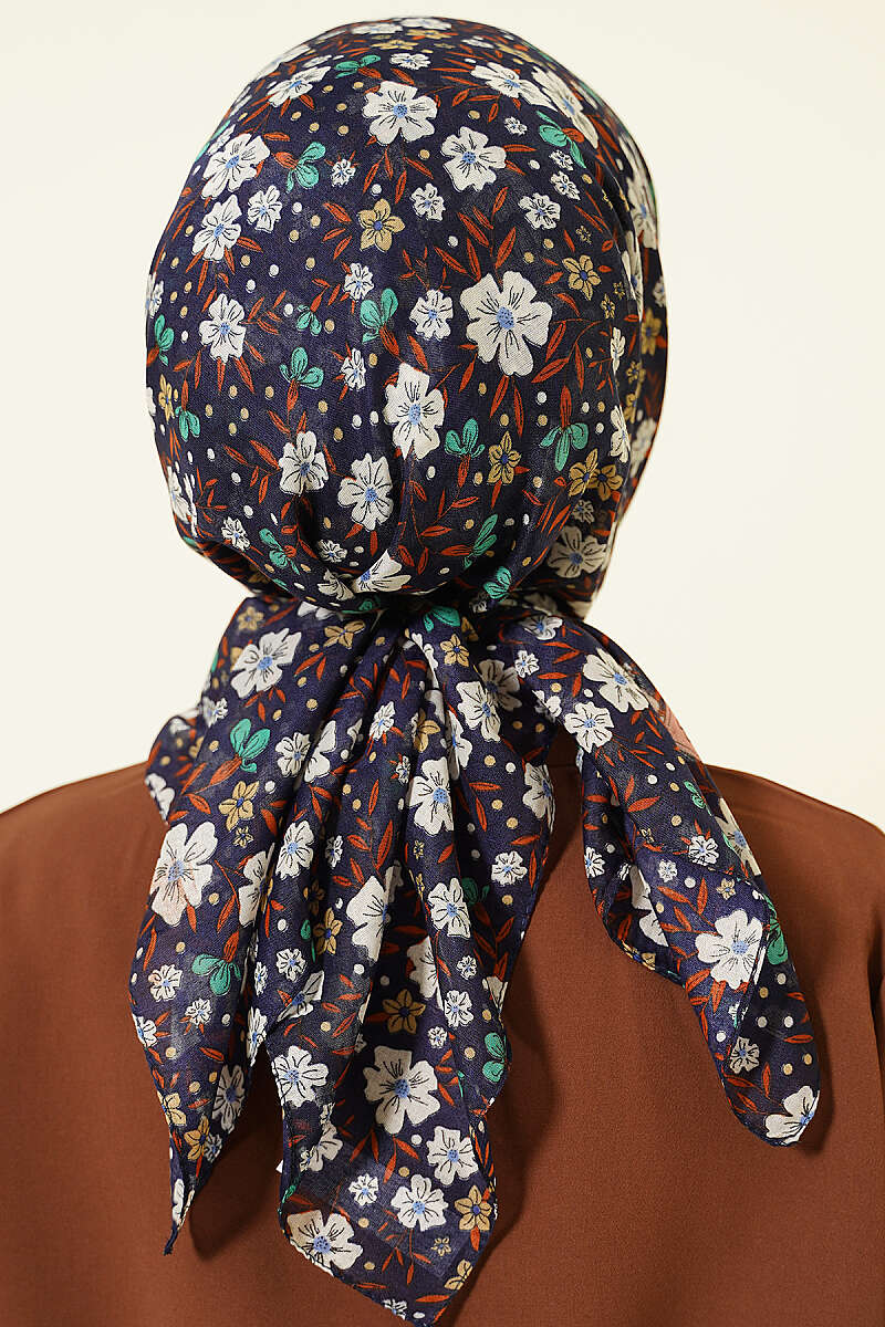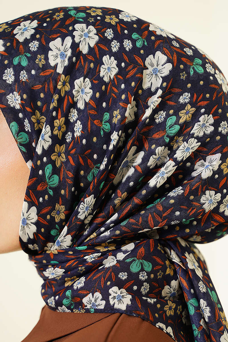 Çiçek Süslemeli Eşarp Lacivert Ekru