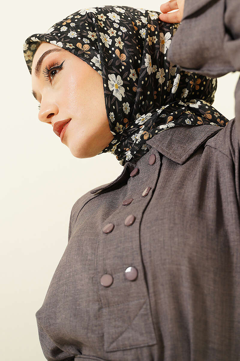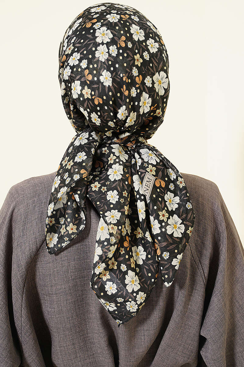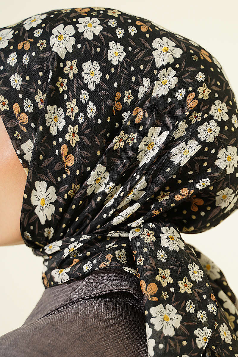 Çiçek Süslemeli Eşarp Siyah Ekru