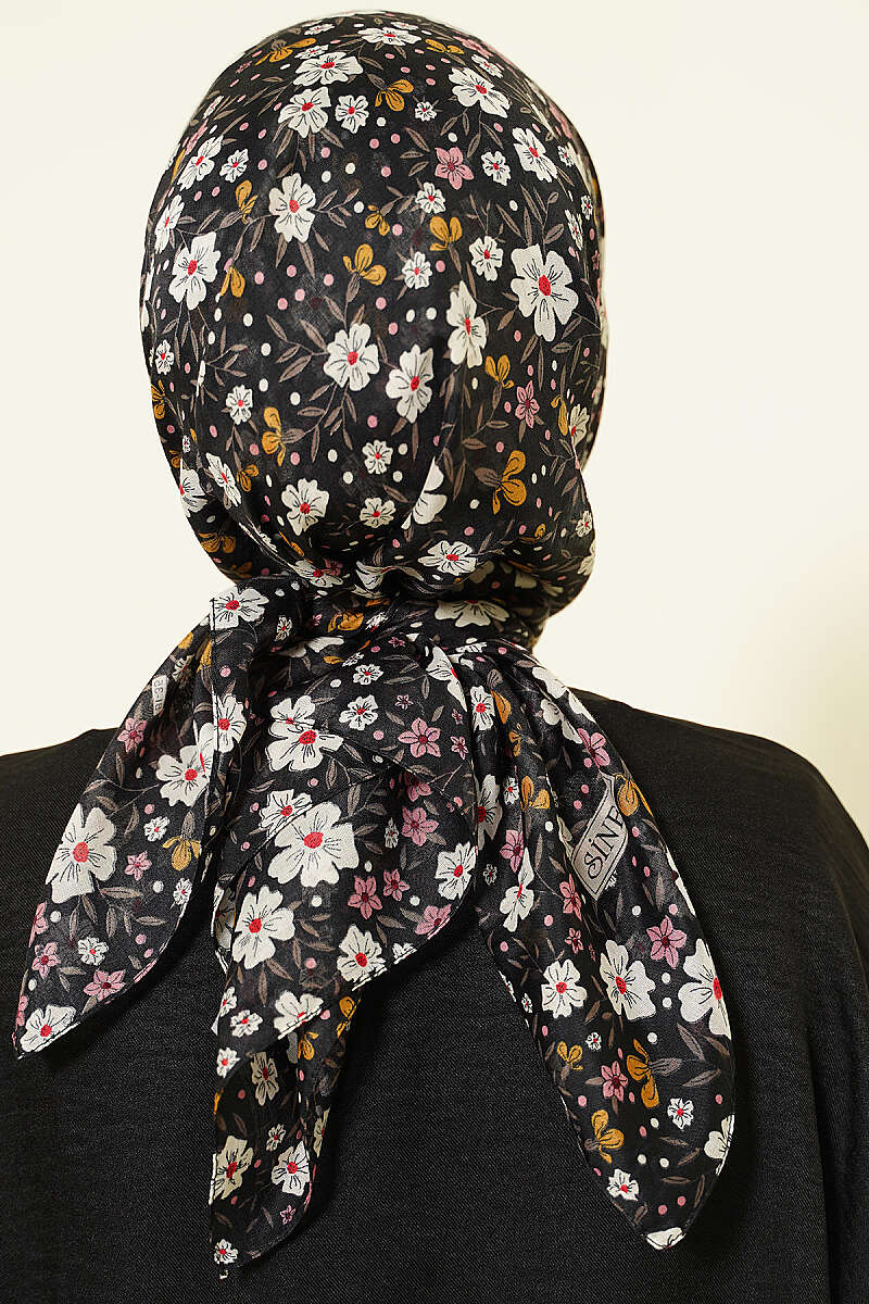 Çiçek Süslemeli Eşarp Siyah Ekru