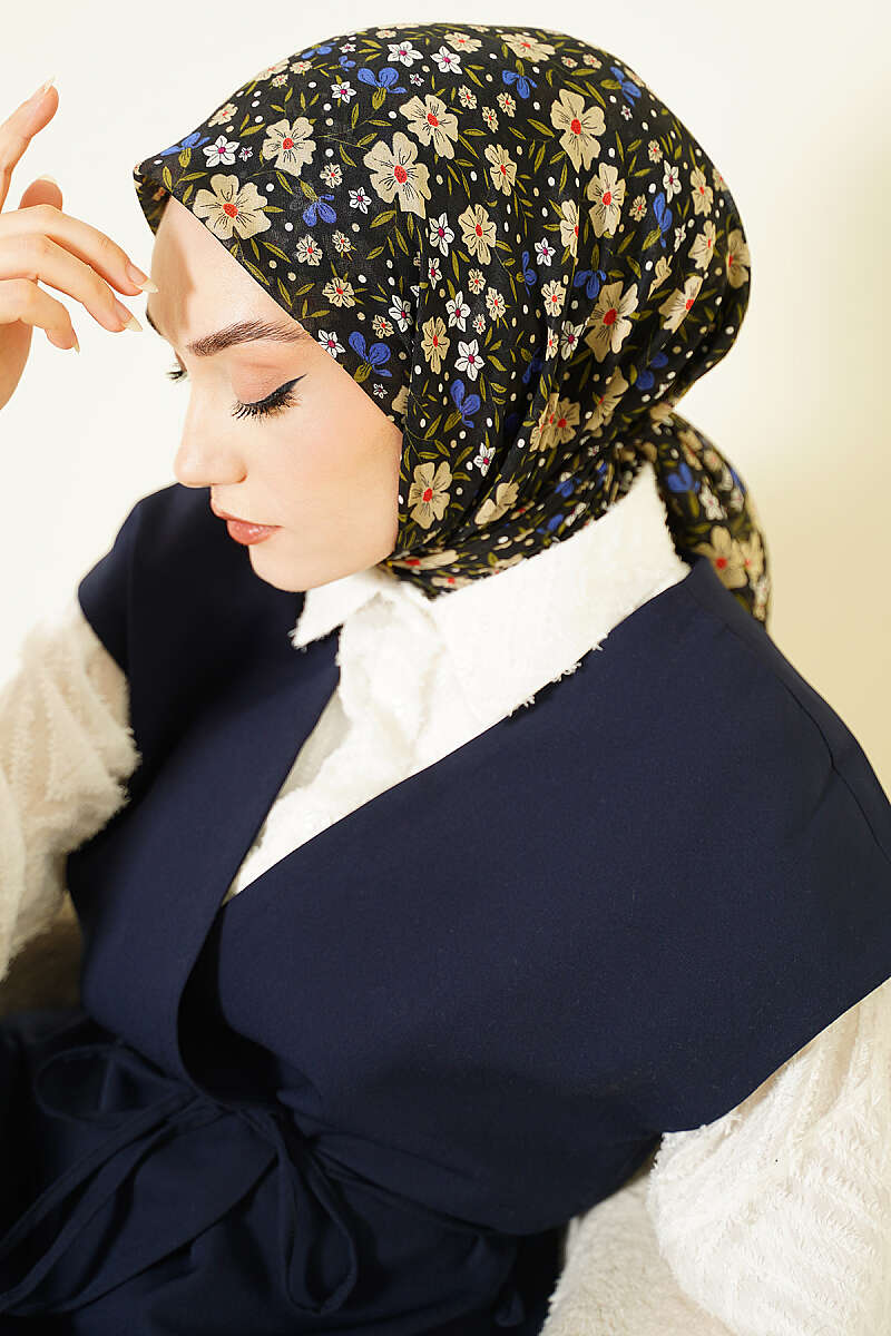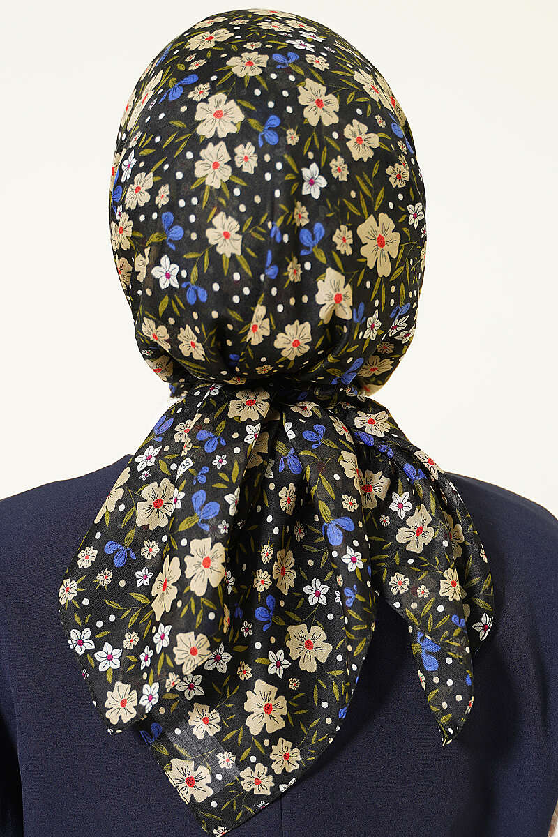 Çiçek Süslemeli Eşarp Lacivert Ekru