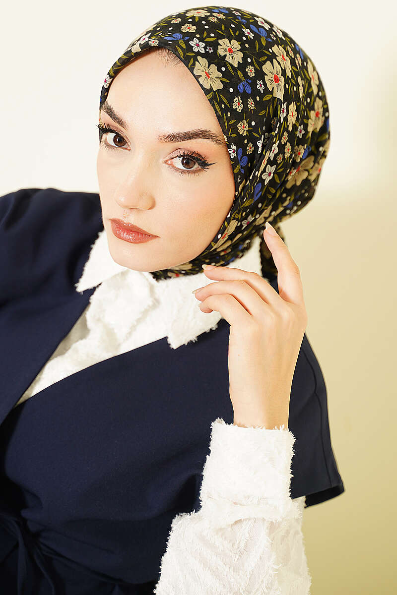Çiçek Süslemeli Eşarp Siyah Yeşil