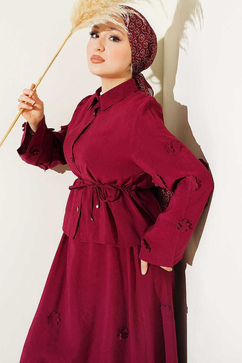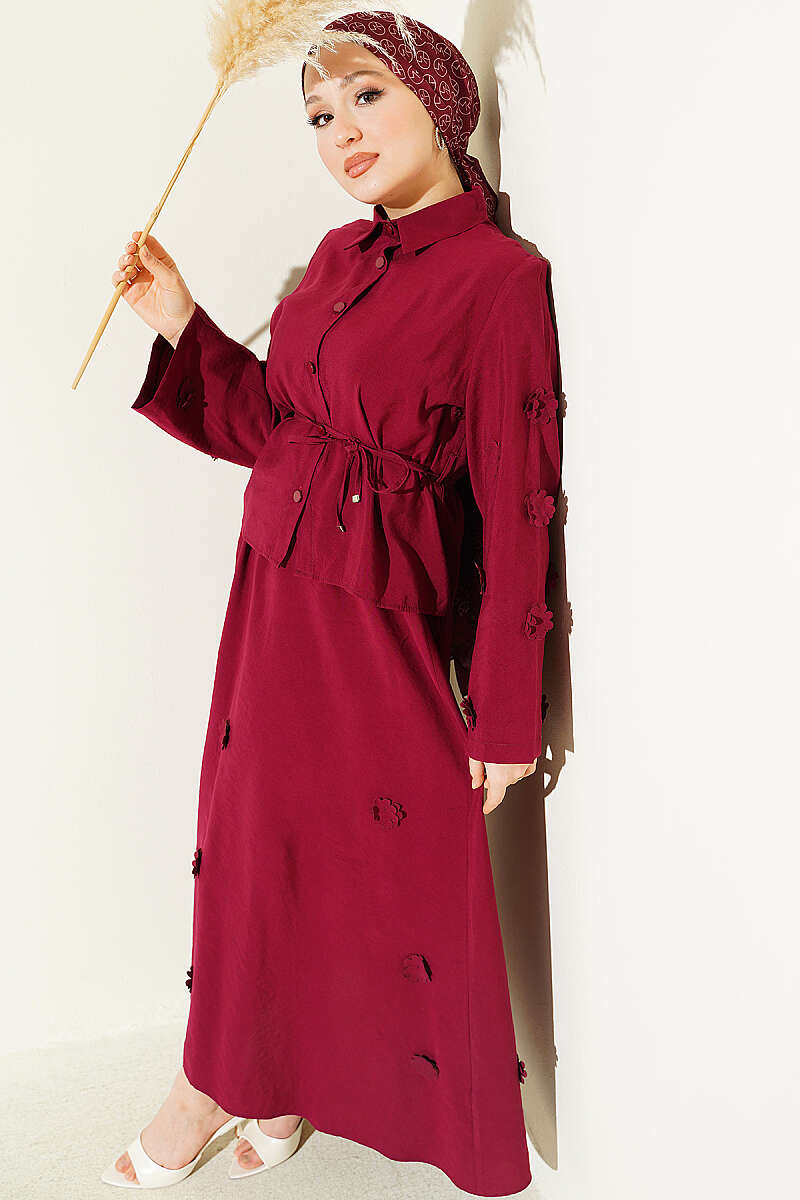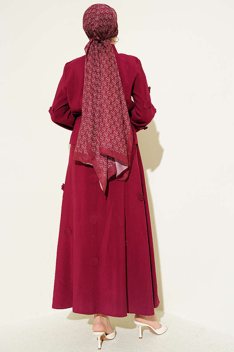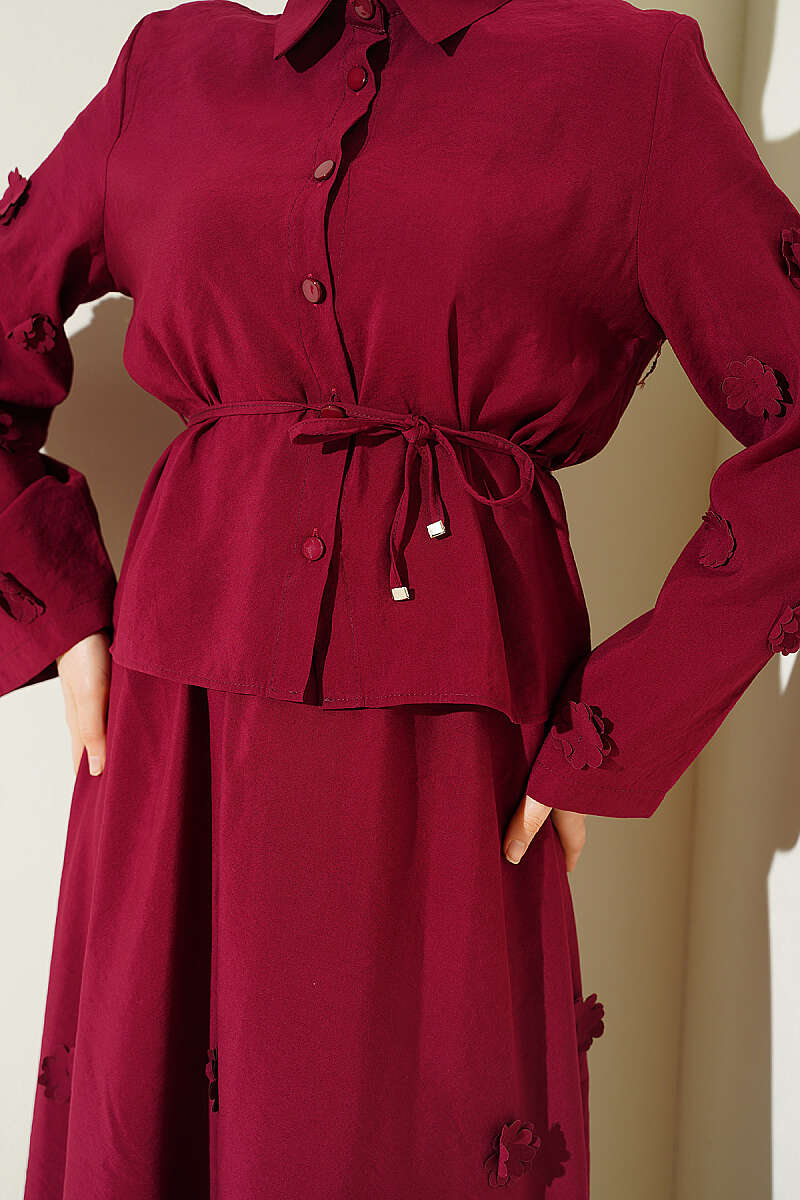 Çiçek Süslemeli Etekli İkili Takım Bordo