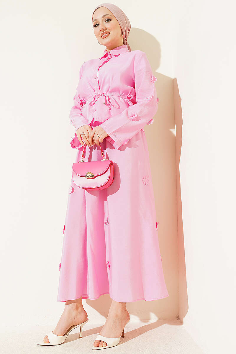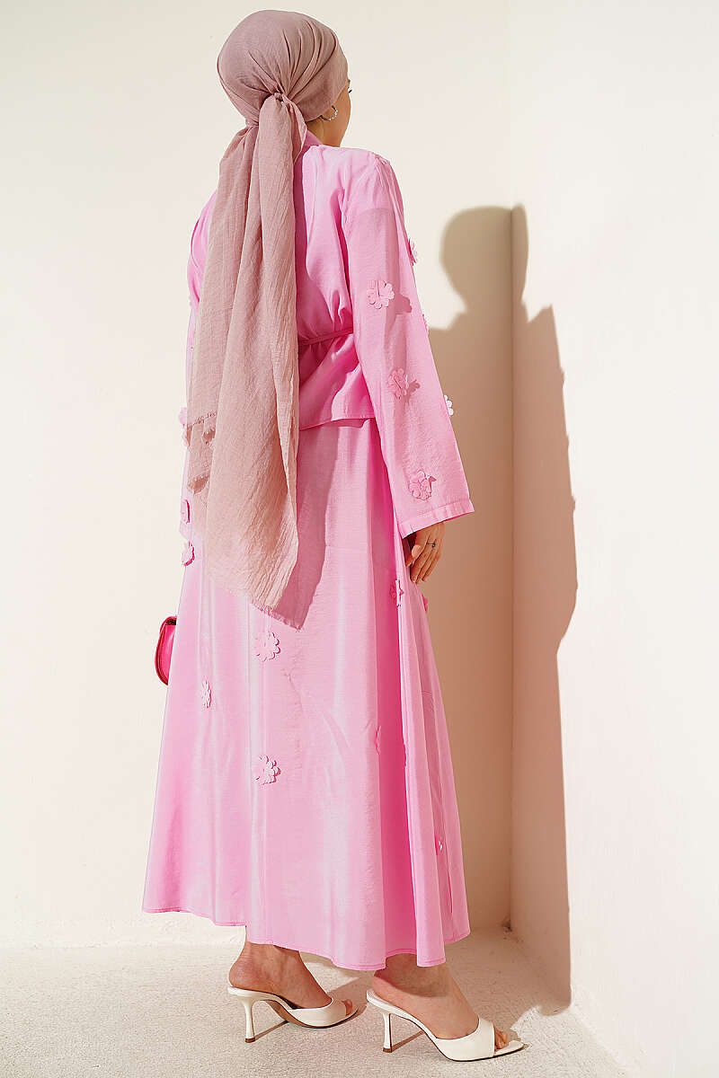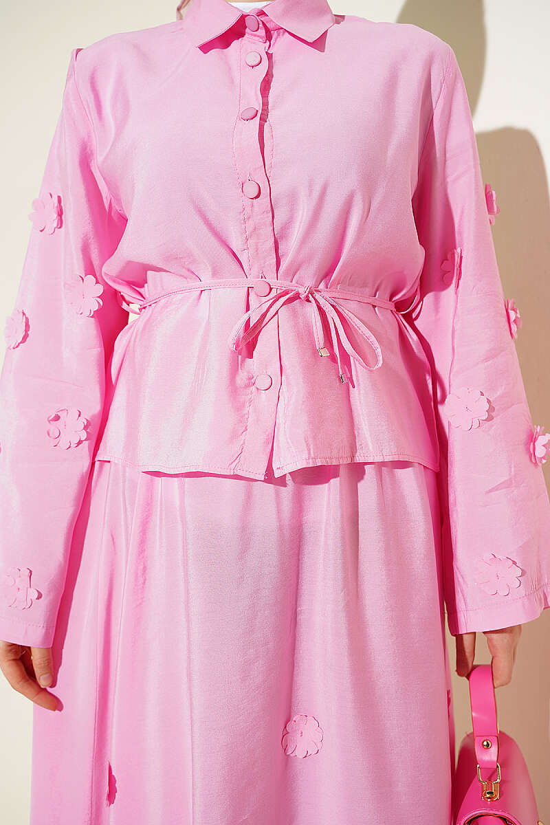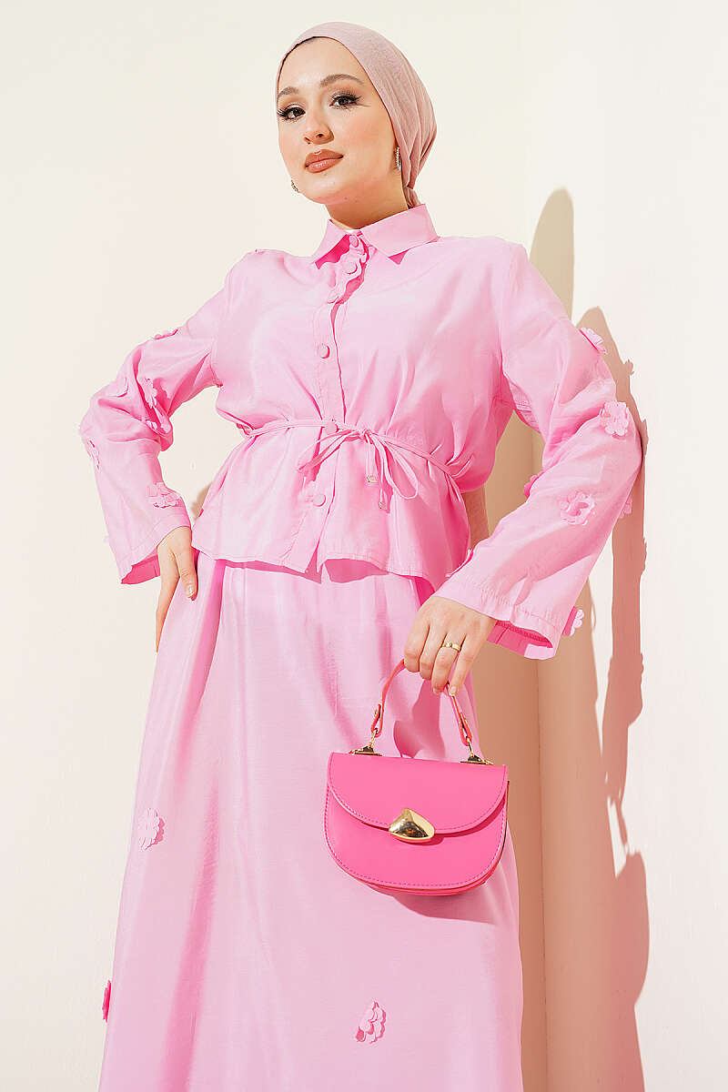 Çiçek Süslemeli Etekli İkili Takım Pembe