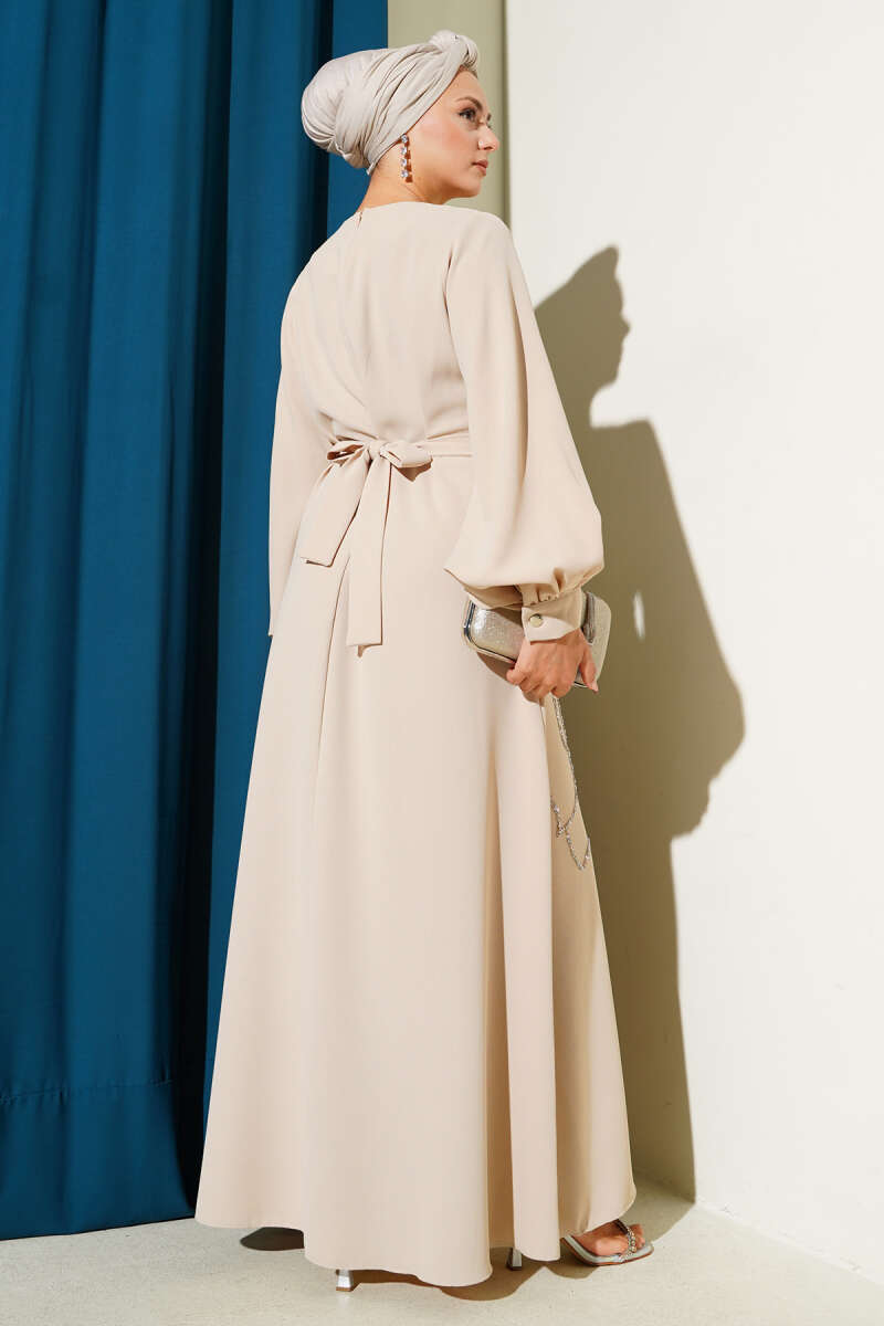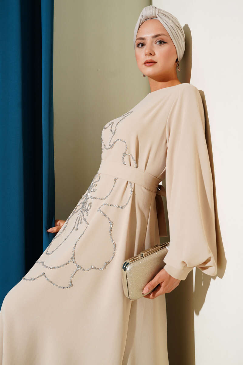 Tül Pelerinli Pul Payet Abiye Elbise Bej