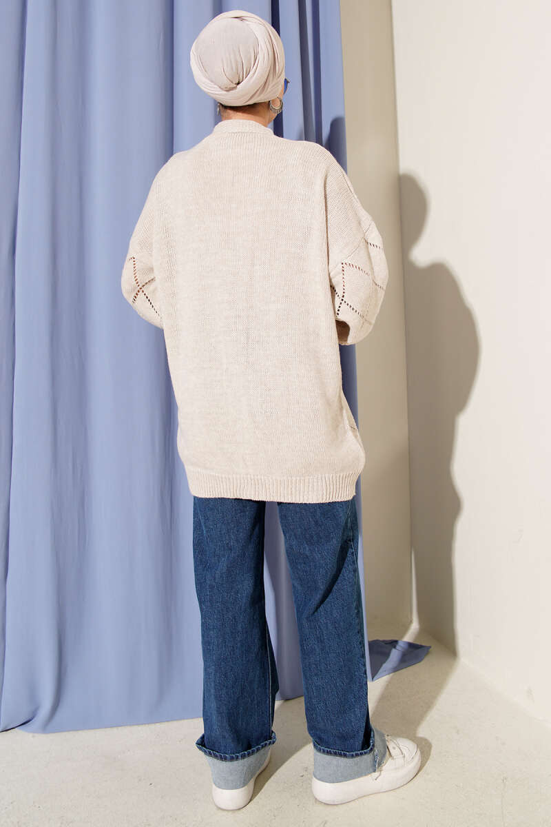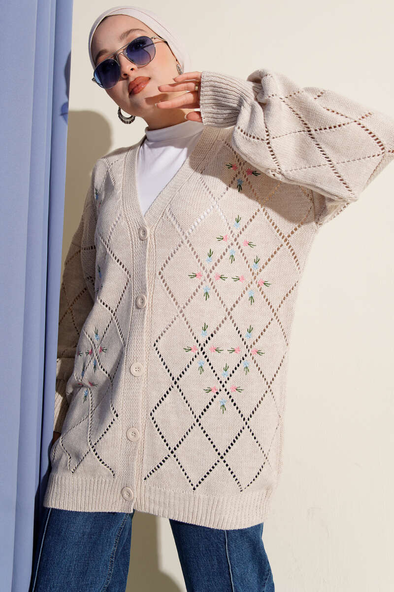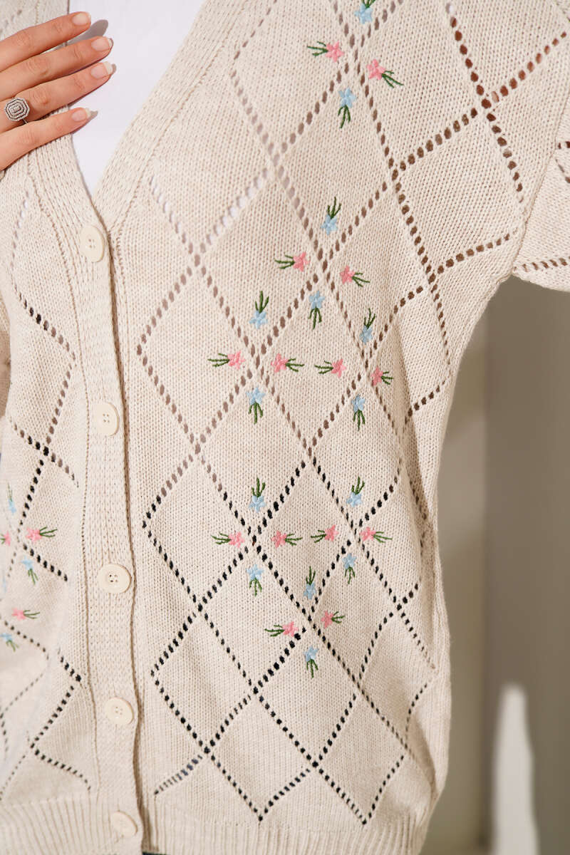 Çiçekli Baklava Desenli Triko Hırka Ekru