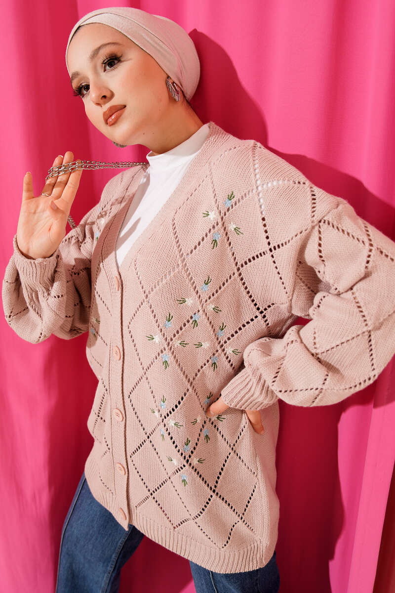 Çiçek Nakışlı Düğmeli Merserize Hırka Vizon