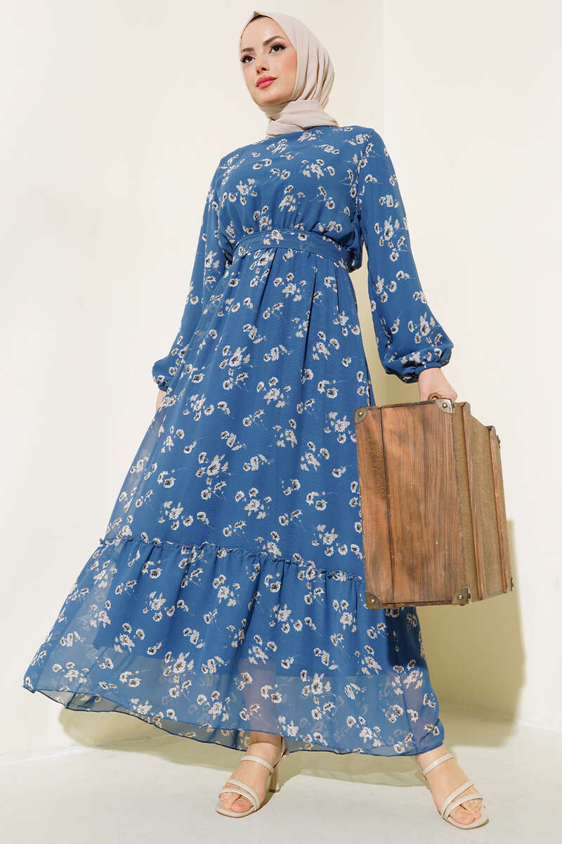 Çiçekli Bel Lastikli Şifon Elbise İndigo
