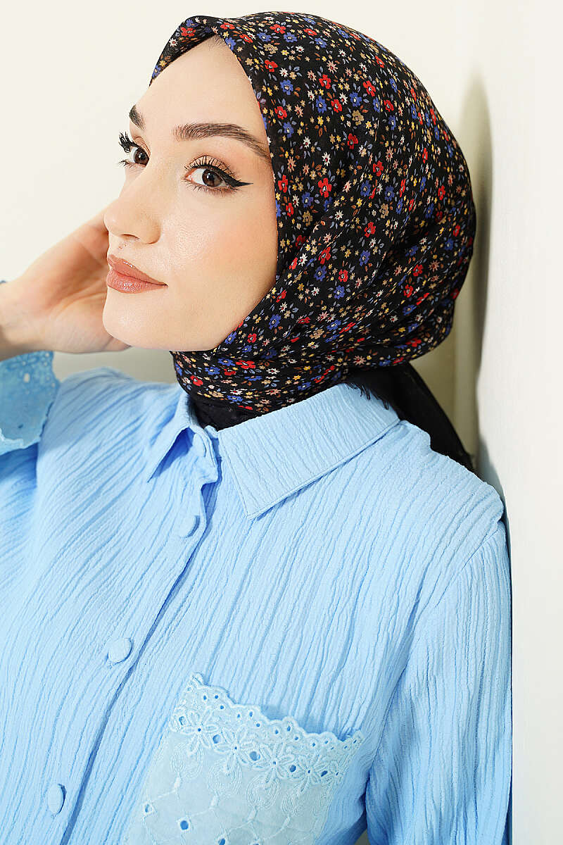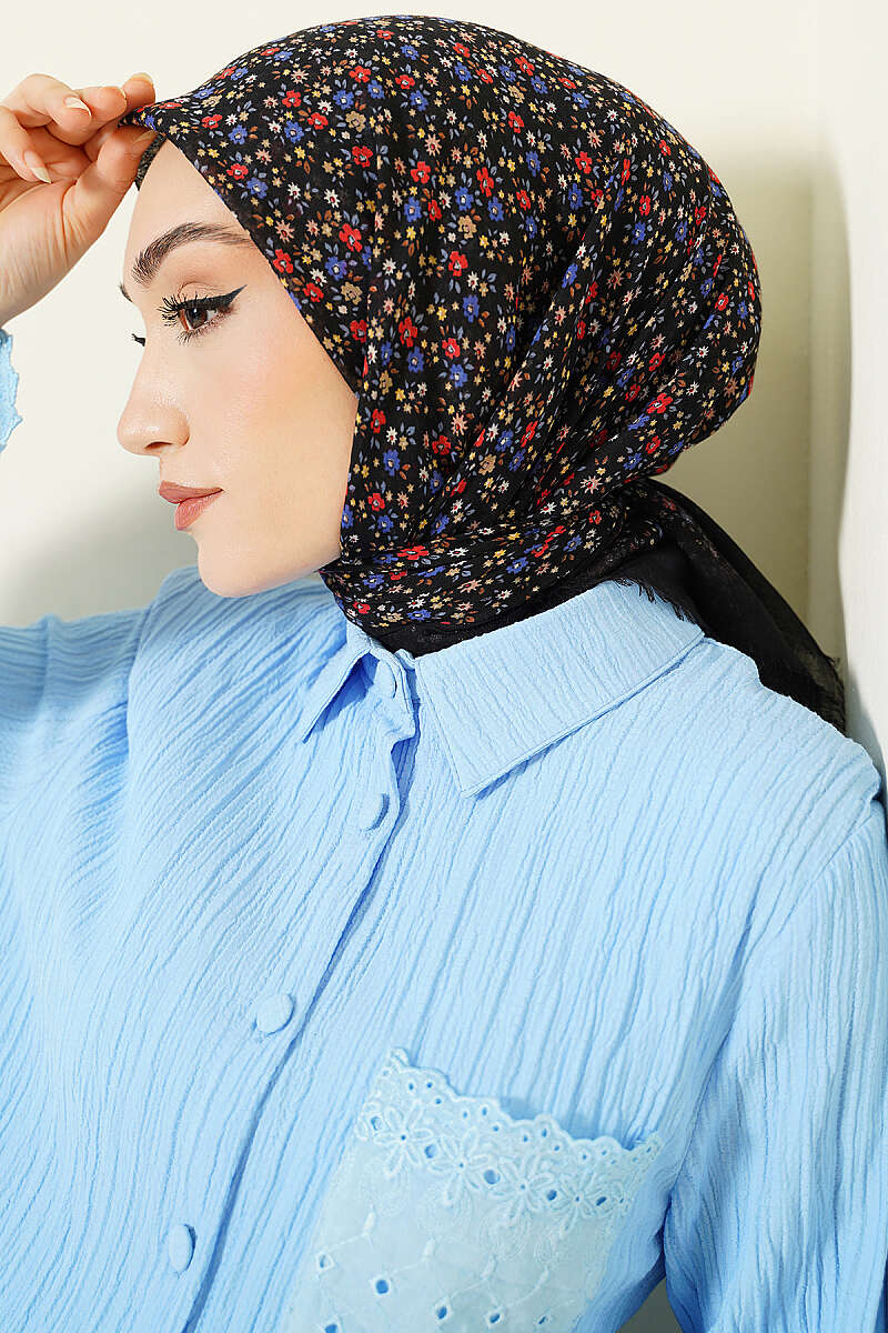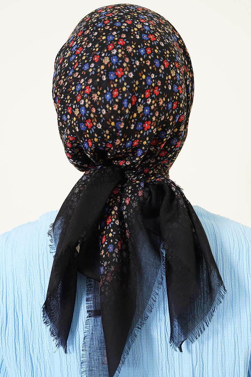 Çiçekli Flamu Cotton Eşarp Siyah Mavi