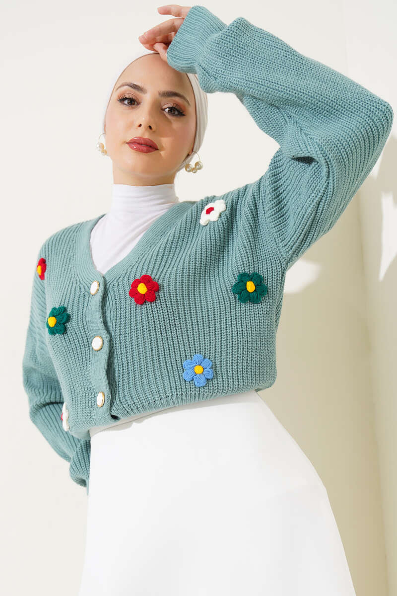Saç Örgülü Düğmeli Triko Hırka Zümrüt