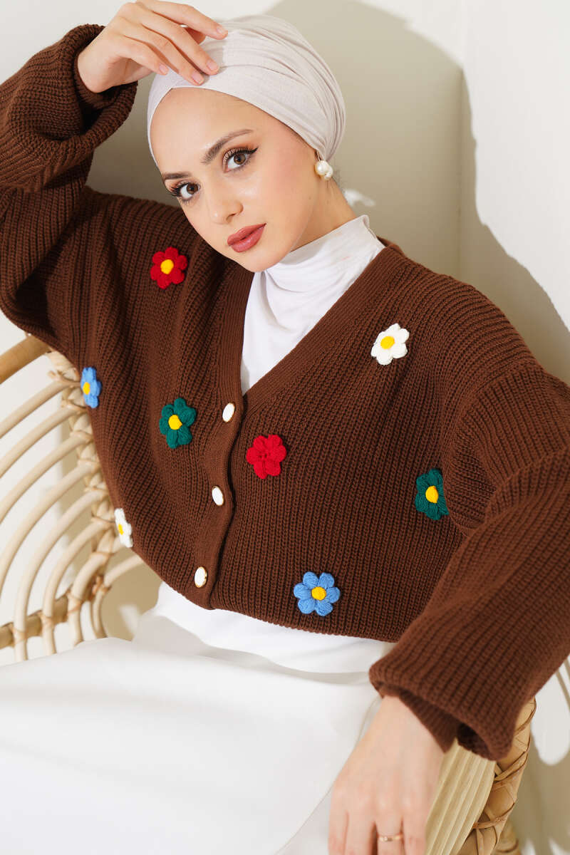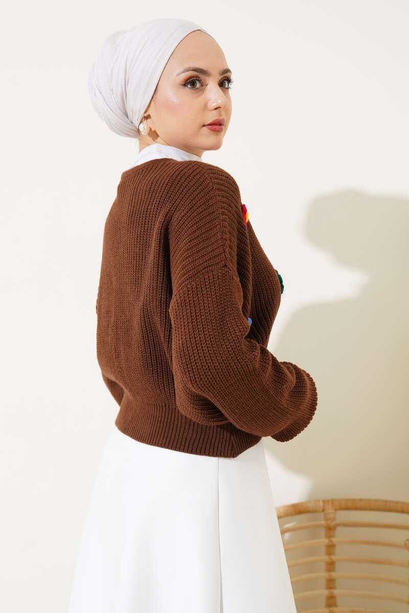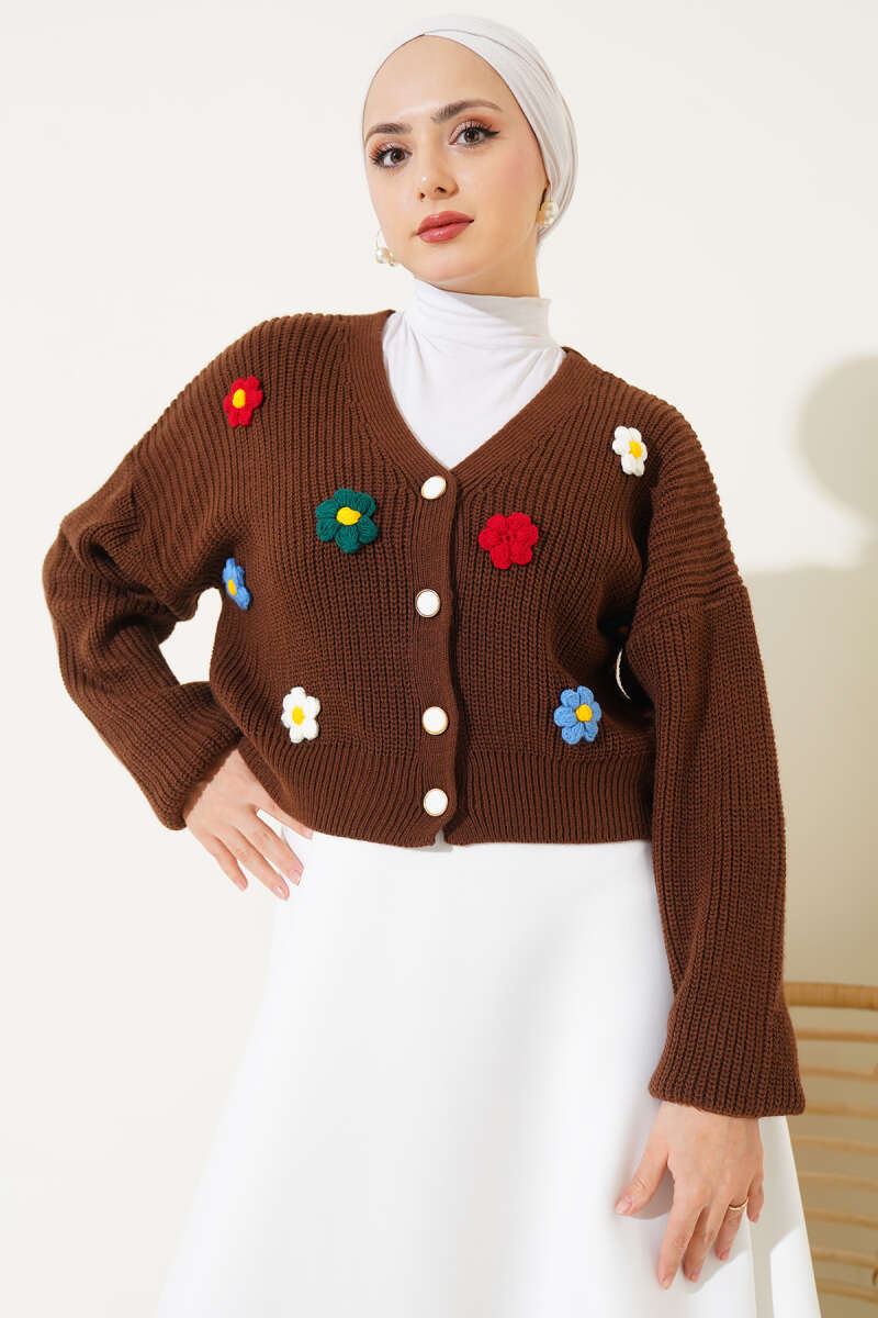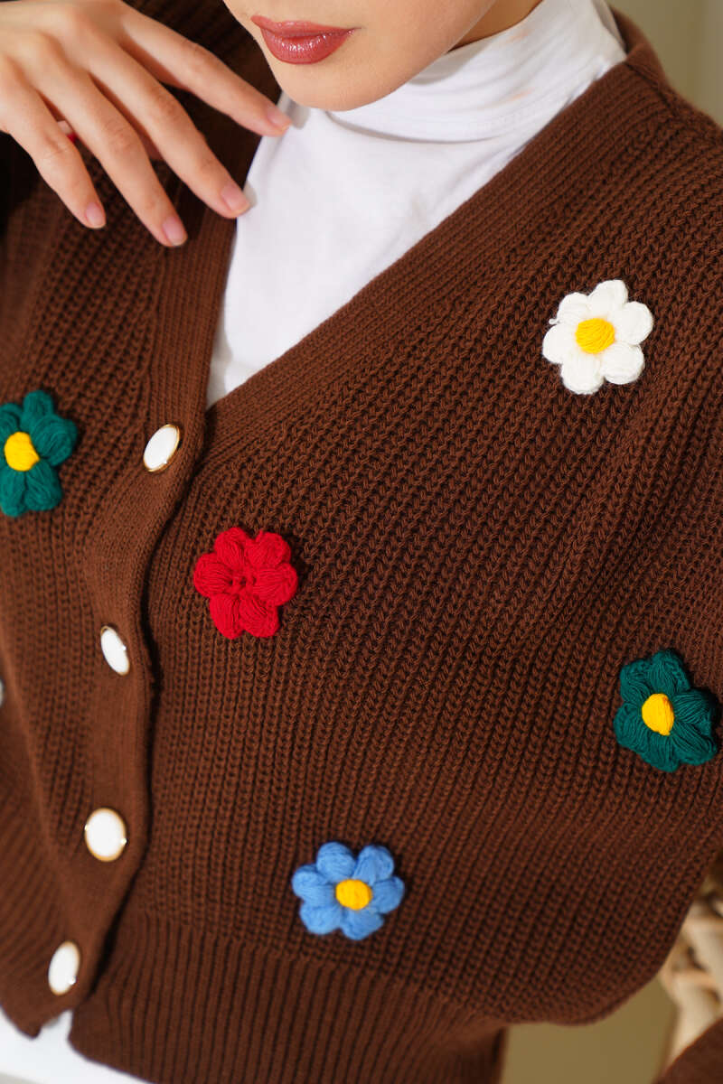Saç Örgülü Düğmeli Triko Hırka Kahve