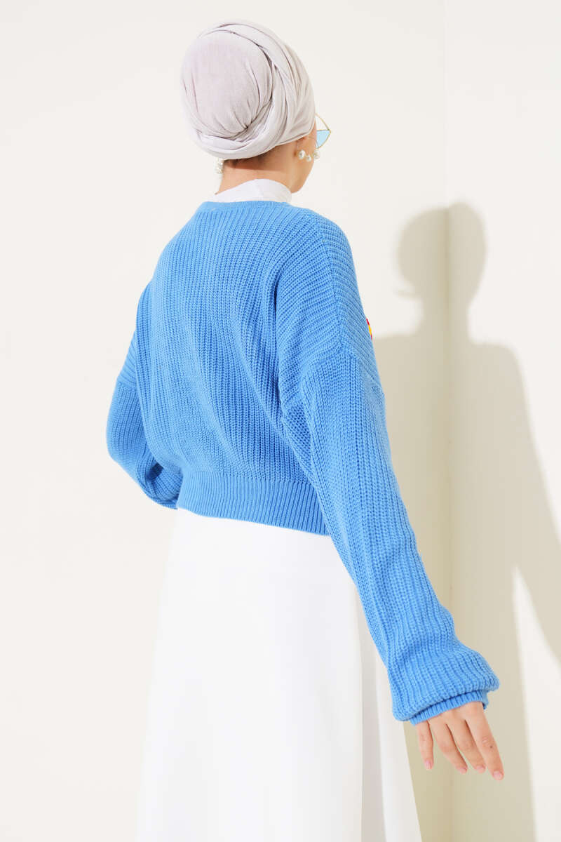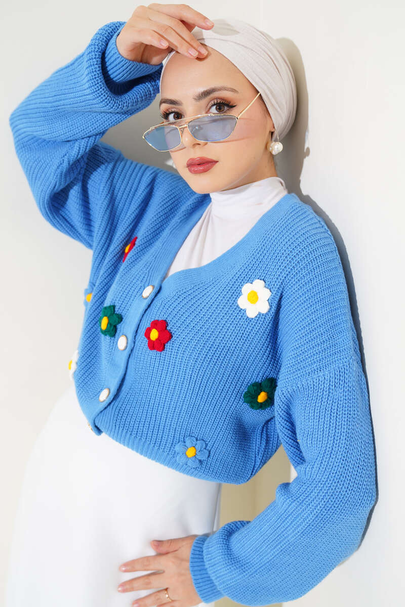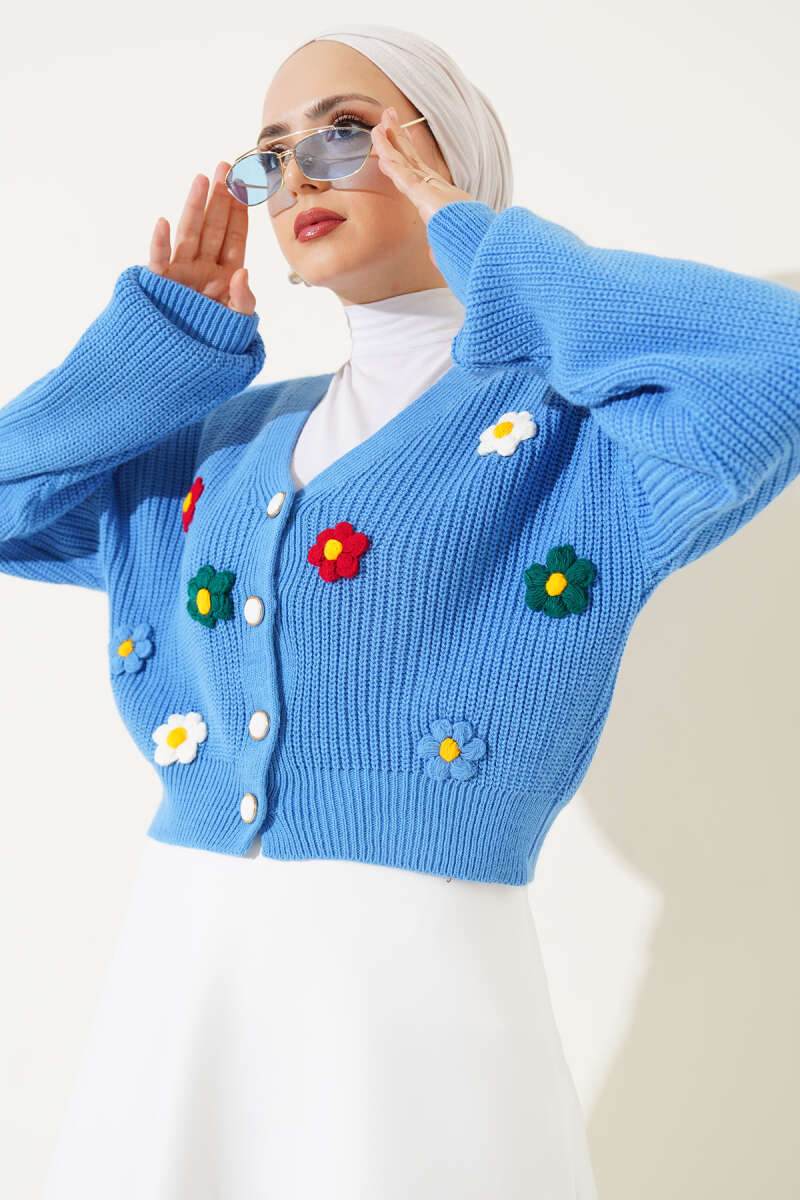 Çiçekli Kısa Triko Hırka Mavi