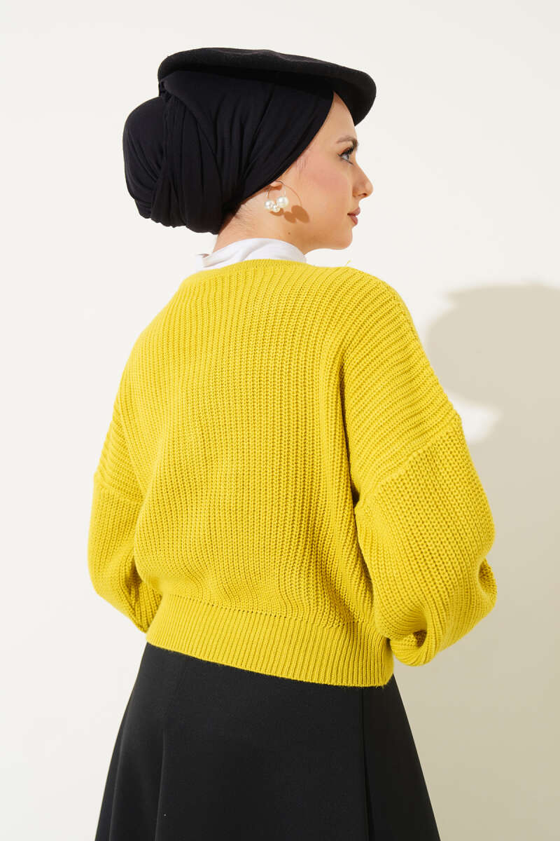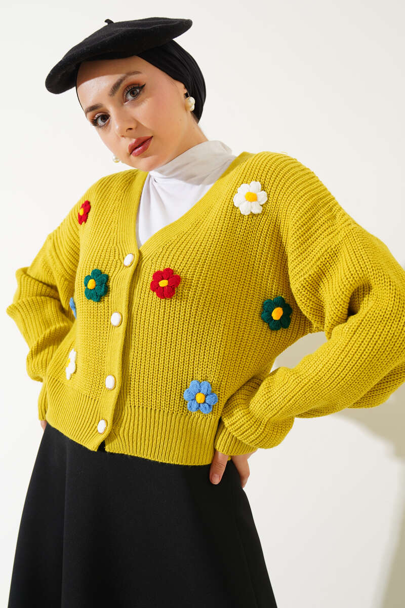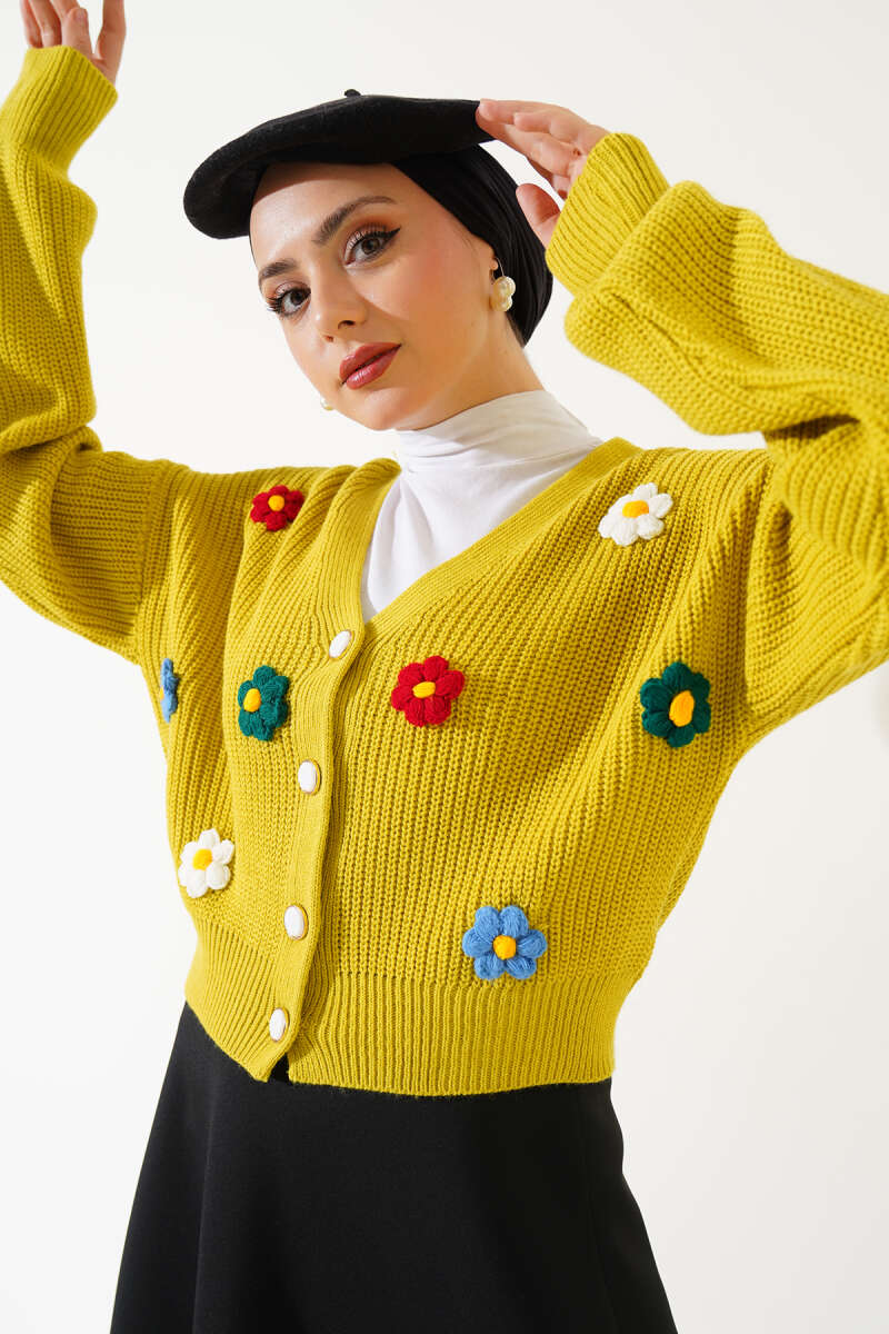 Çiçekli Kısa Triko Hırka Yağ Yeşili