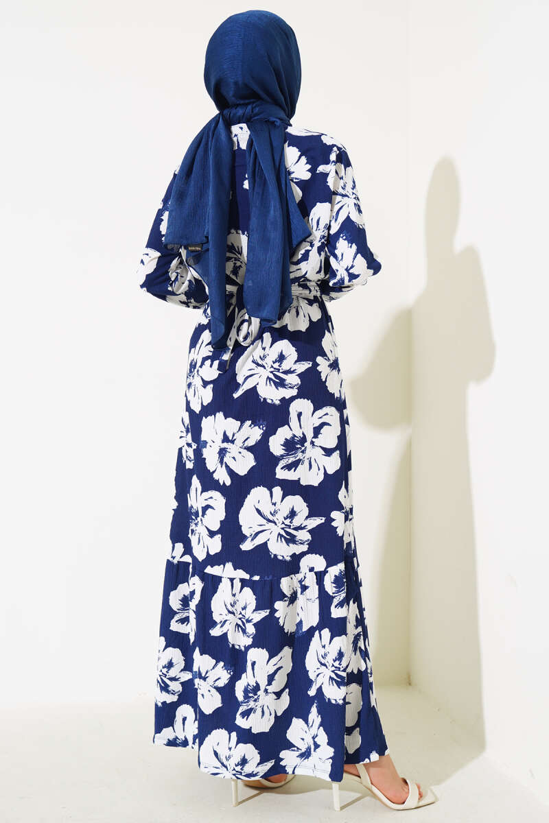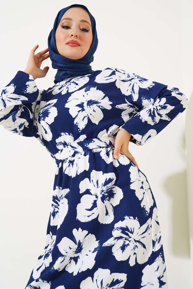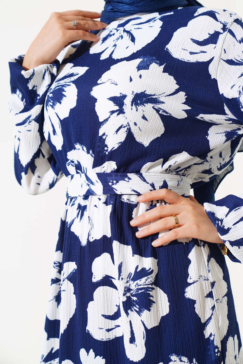 Çiçekli Kuşaklı Bürümcük Elbise Lacivert