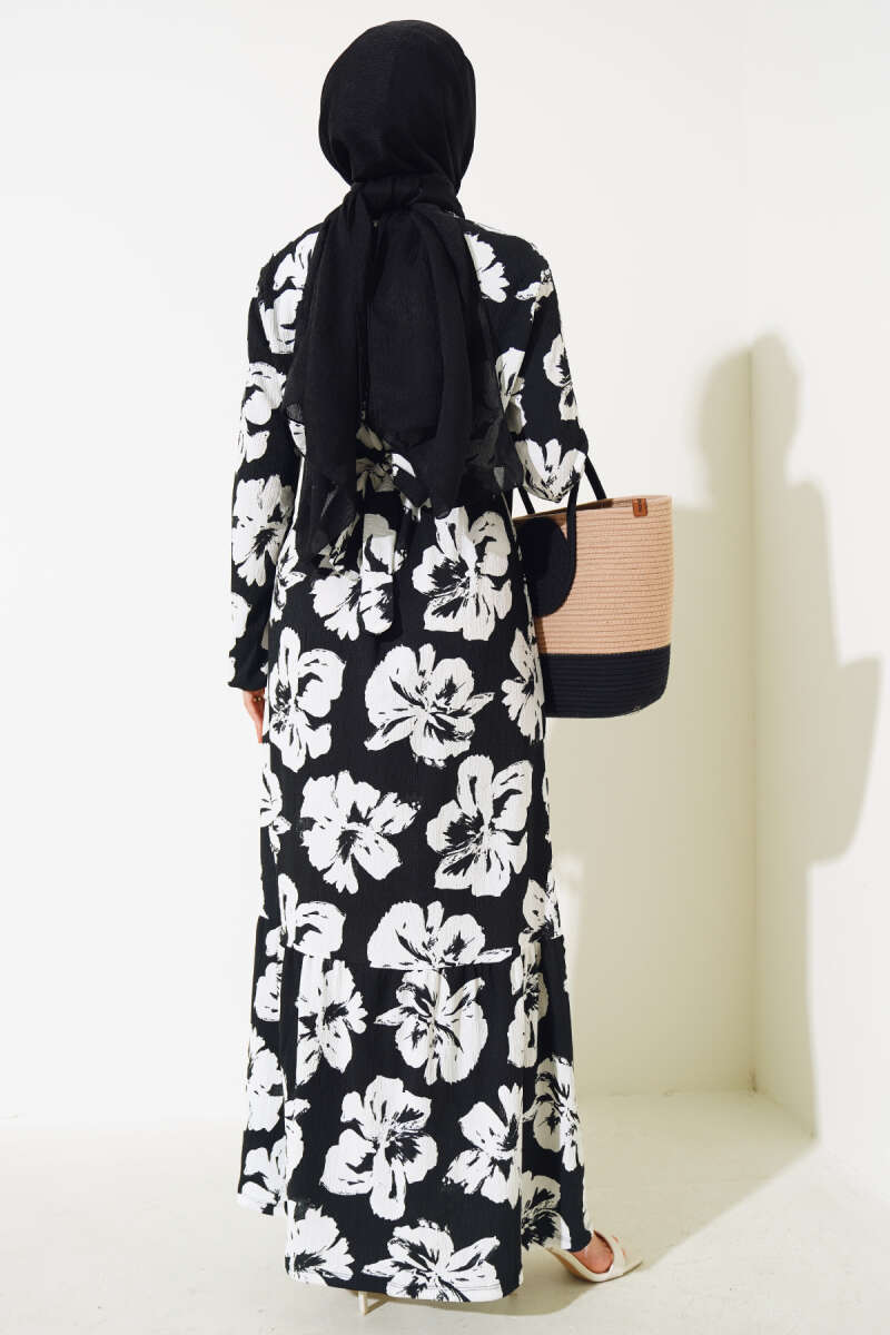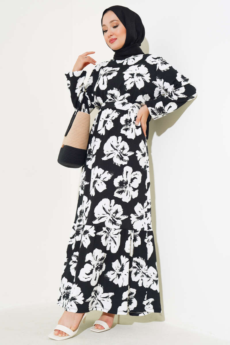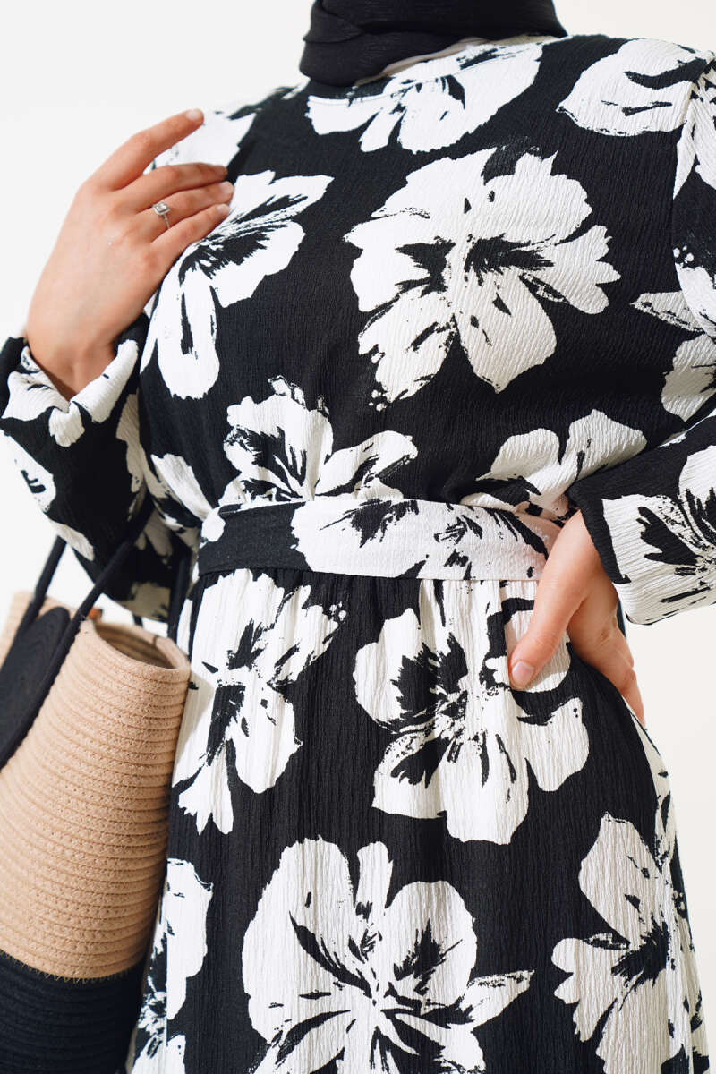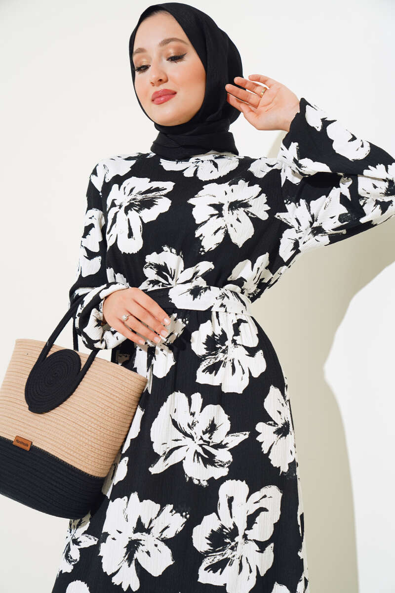 Çiçekli Kuşaklı Bürümcük Elbise Siyah