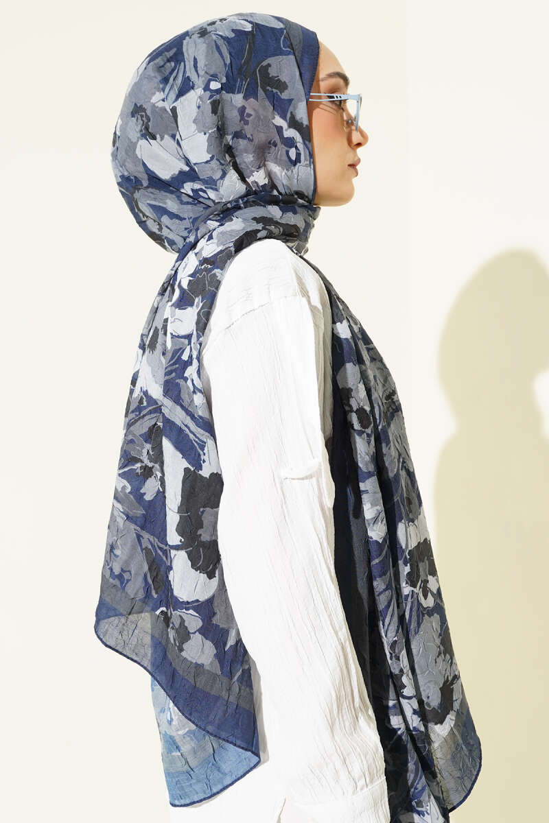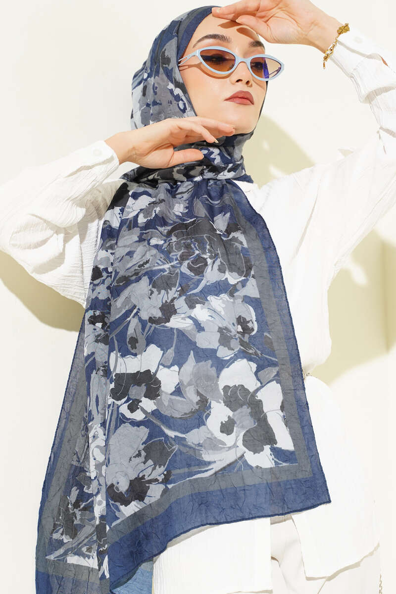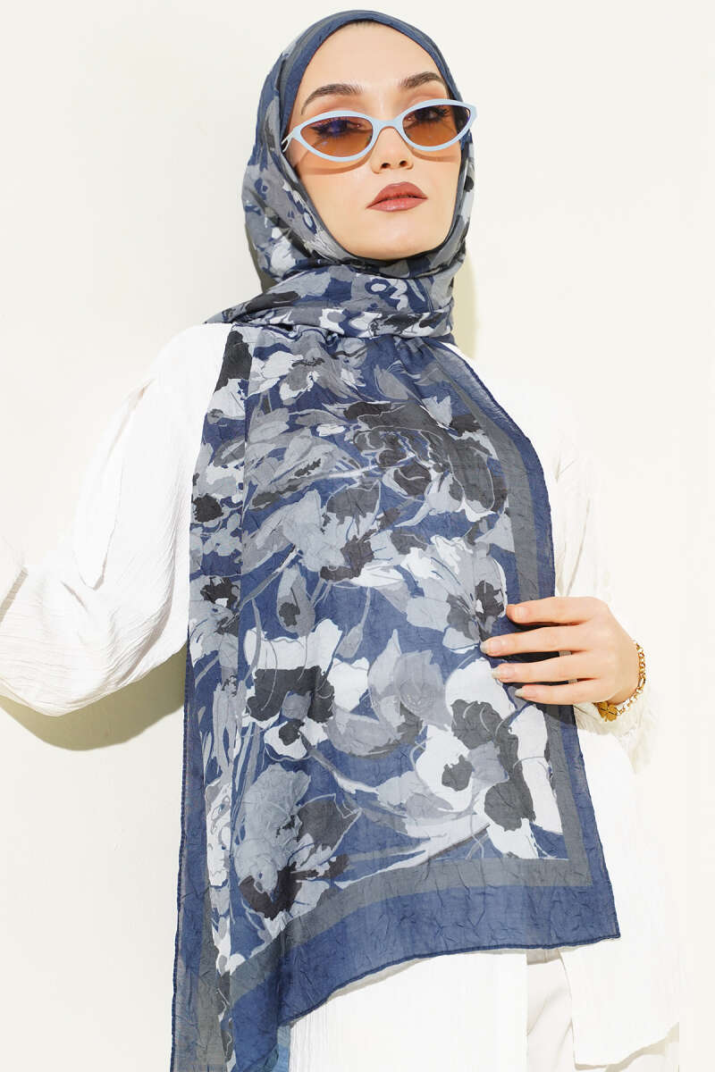 Çiçekli Soft Bambu Kraş Şal Lacivert