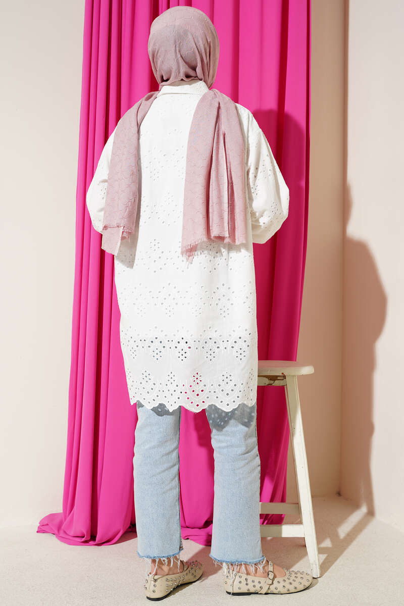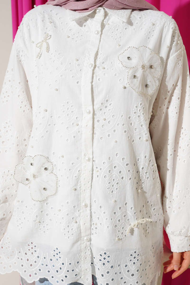Çiçekli Taşlı Brodeli Tunik Beyaz