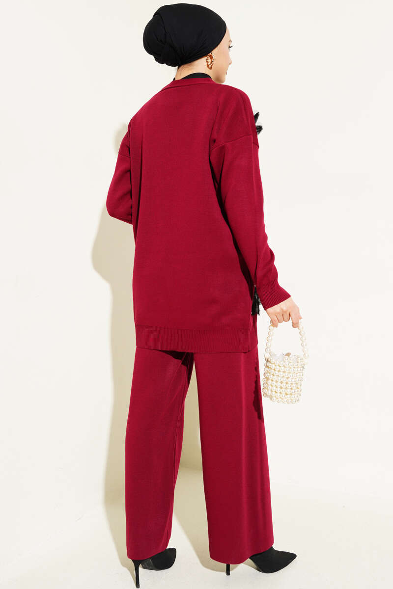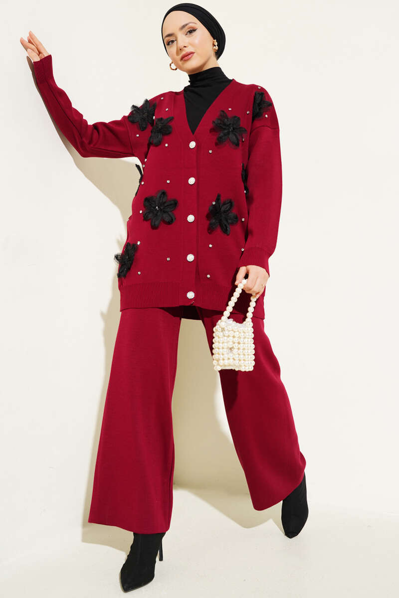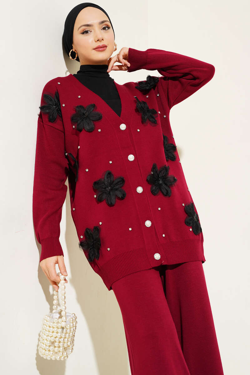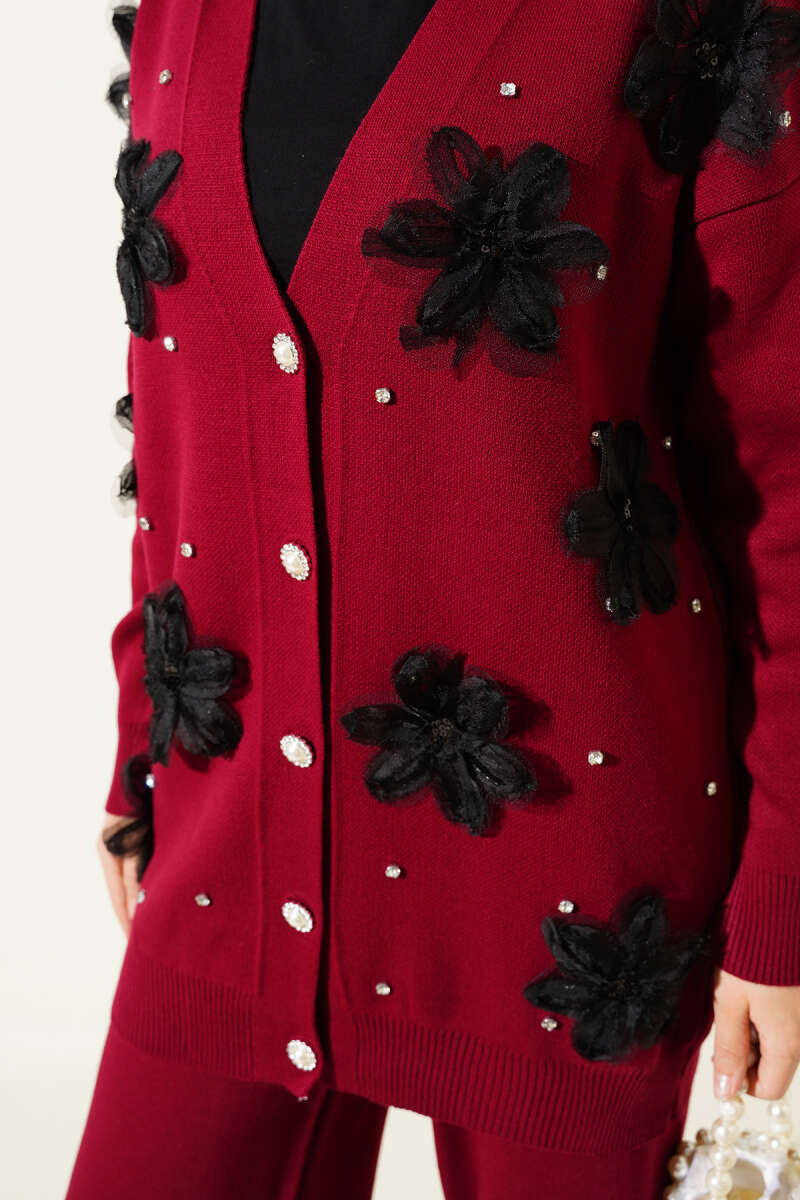 Çiçekli Taşlı Hırkalı Triko İkili Takım Bordo