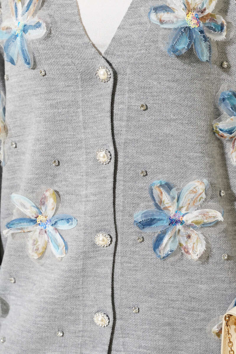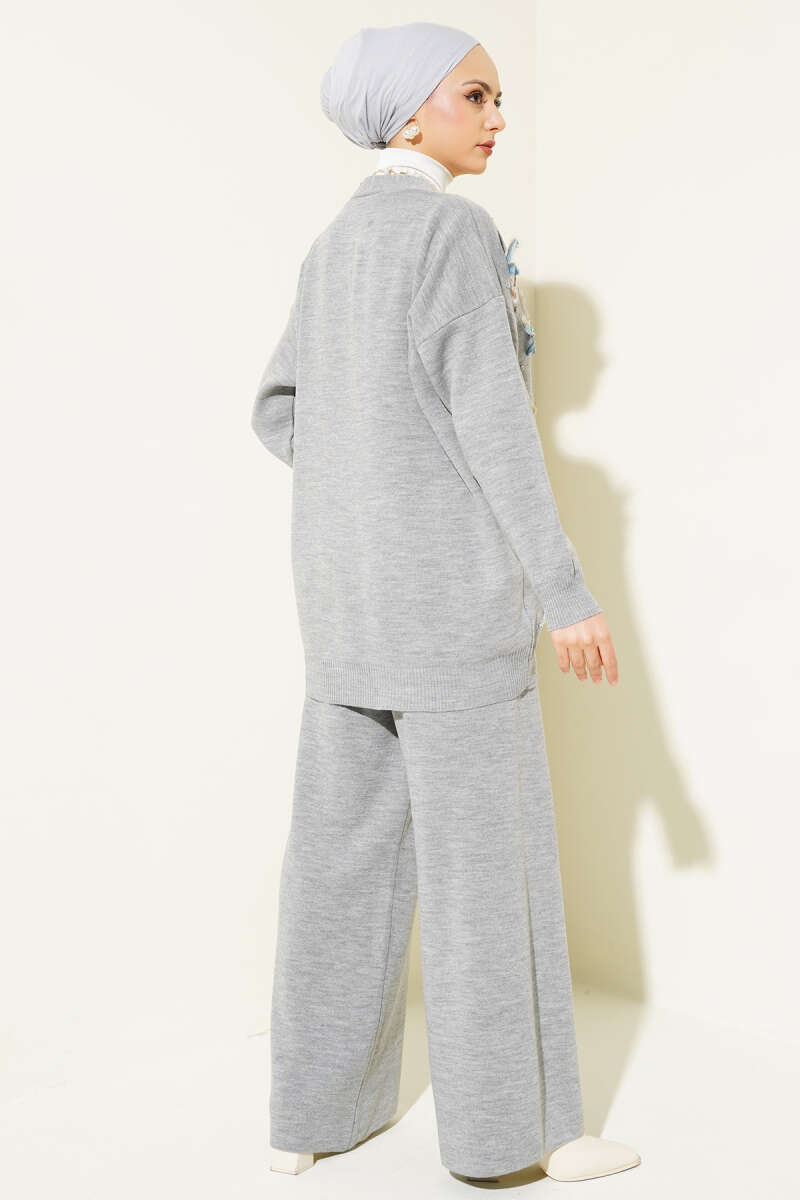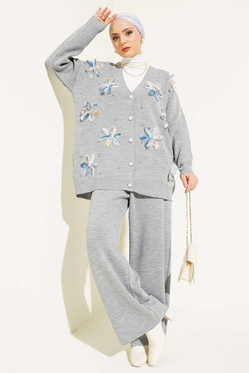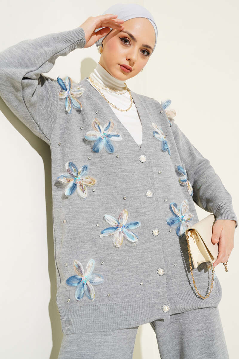 Çiçekli Taşlı Hırkalı Triko İkili Takım Gri