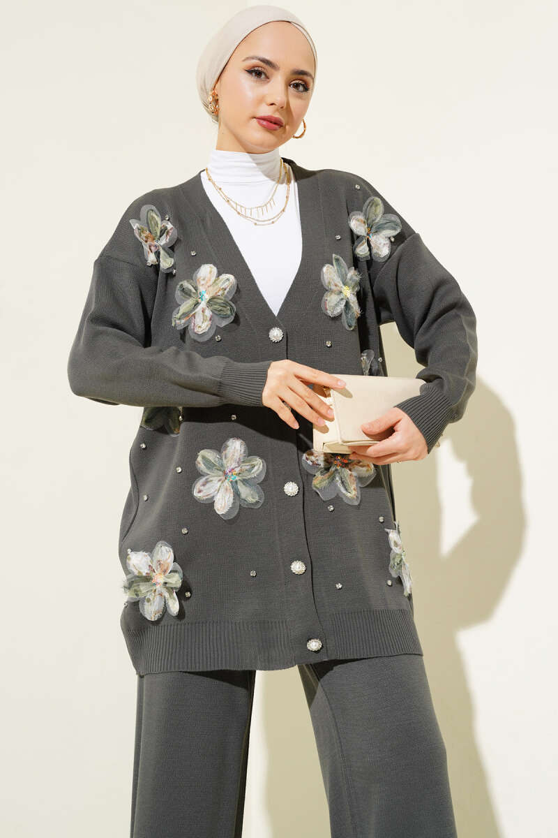 Taşlı Baklava Desen Triko İkili Takım Kahve