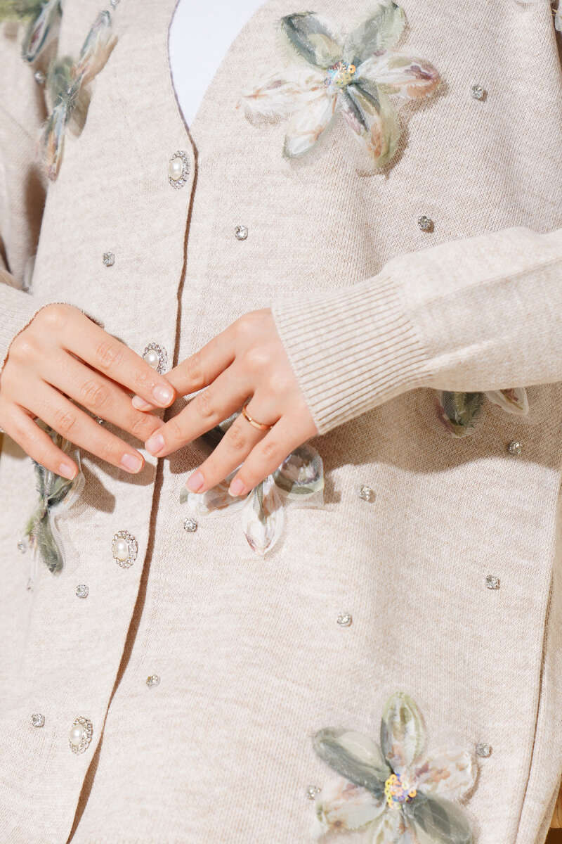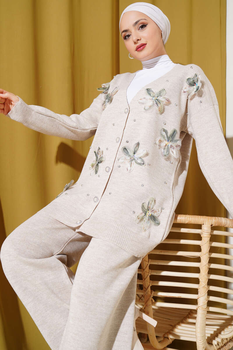 Çiçekli Taşlı Hırkalı Triko İkili Takım Vizon