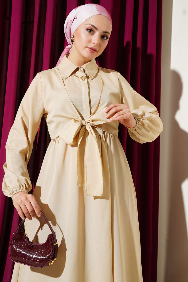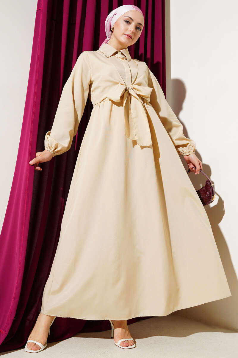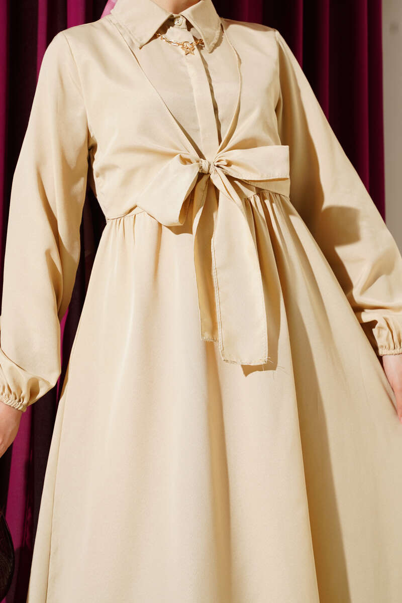 Çift Bağlamalı Düğmeli Elbise Bej