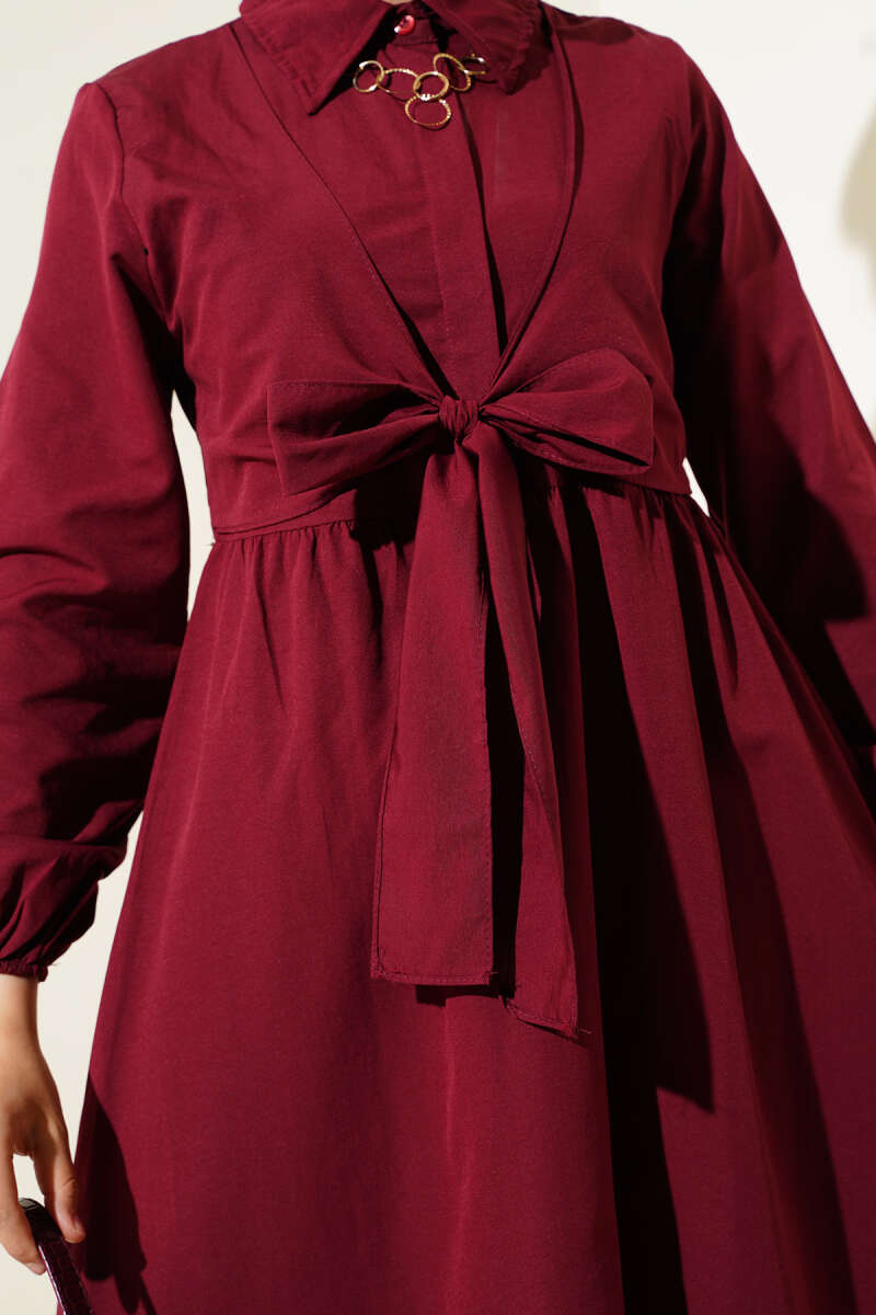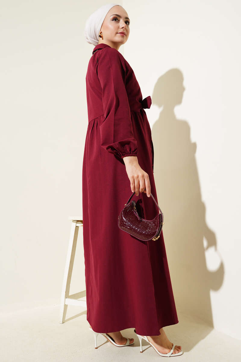 Çift Bağlamalı Düğmeli Elbise Bordo