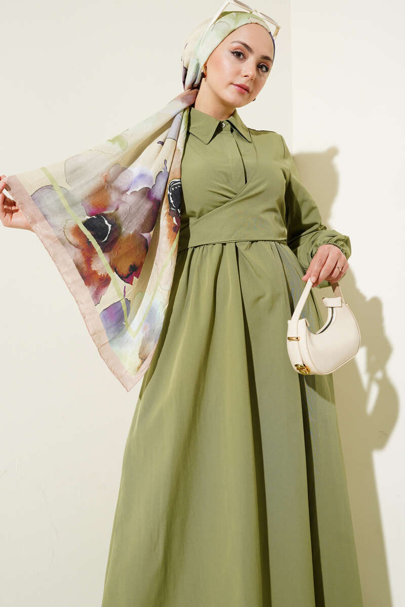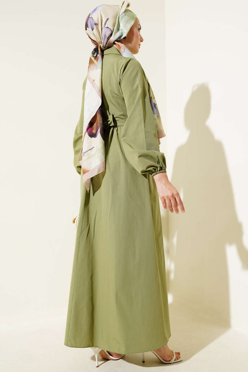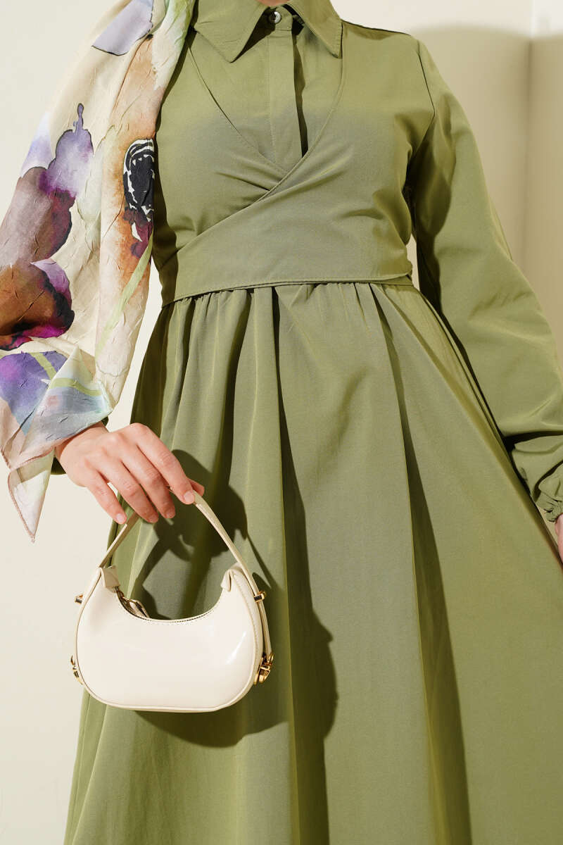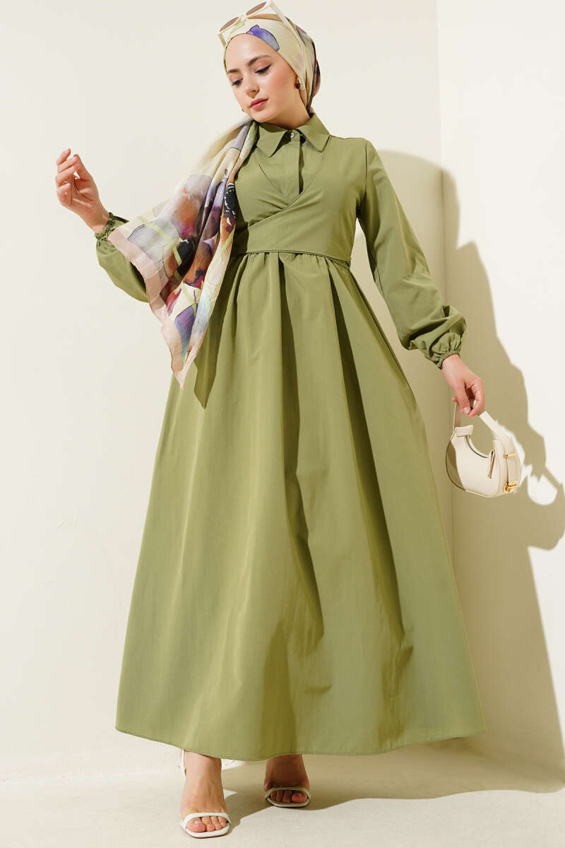 Çift Bağlamalı Düğmeli Elbise Çağla Yeşili