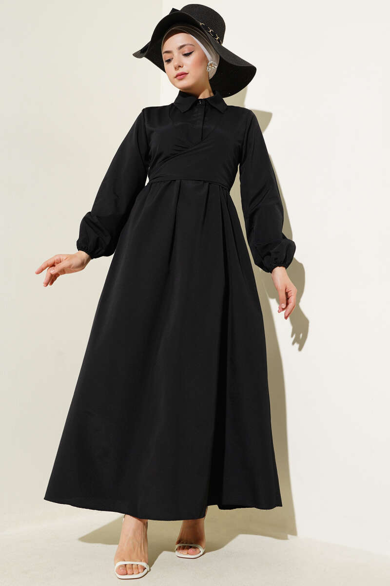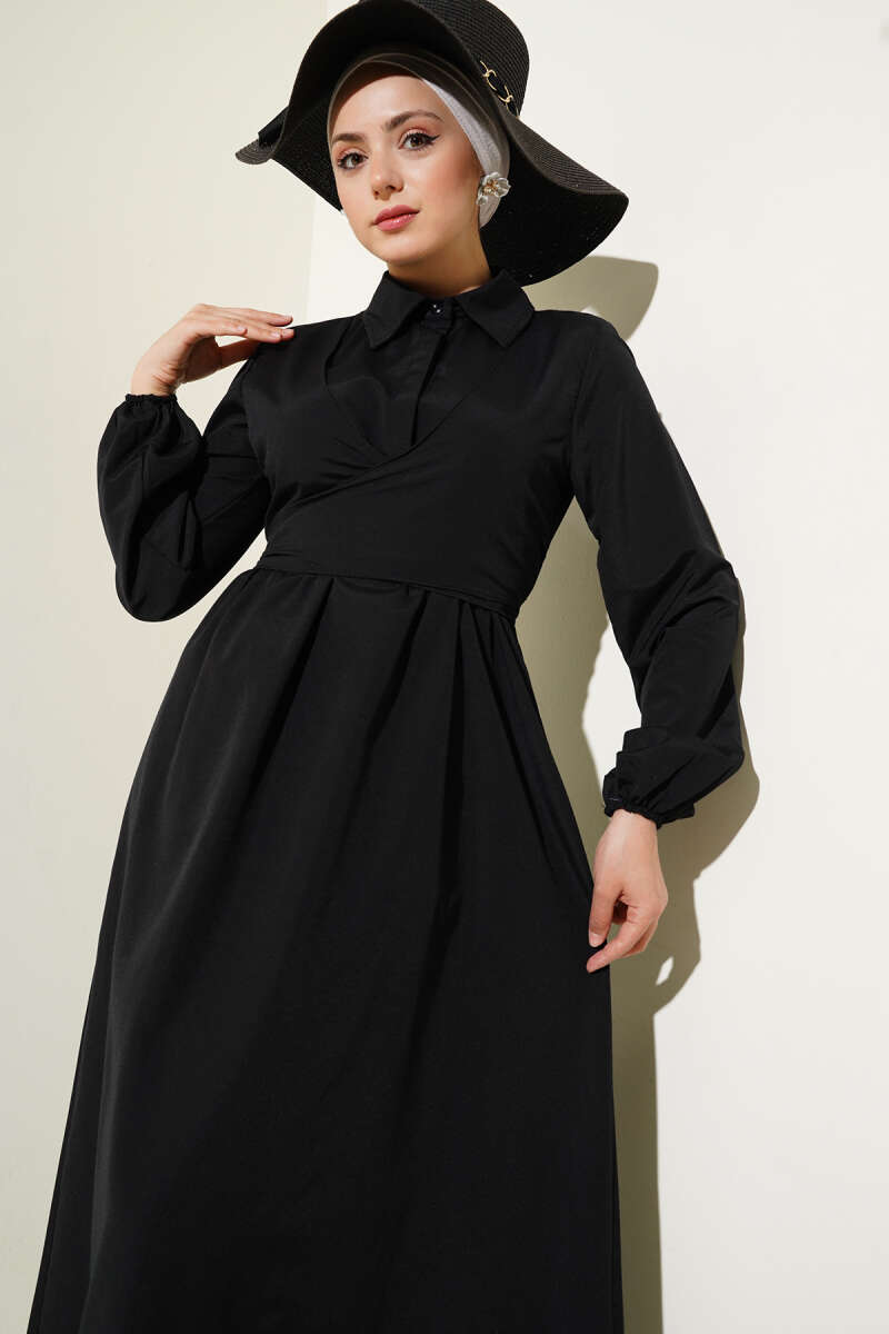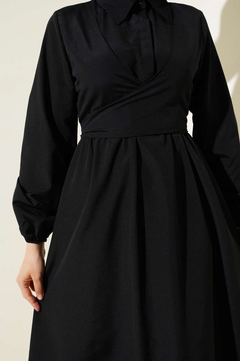Çift Bağlamalı Düğmeli Elbise Siyah