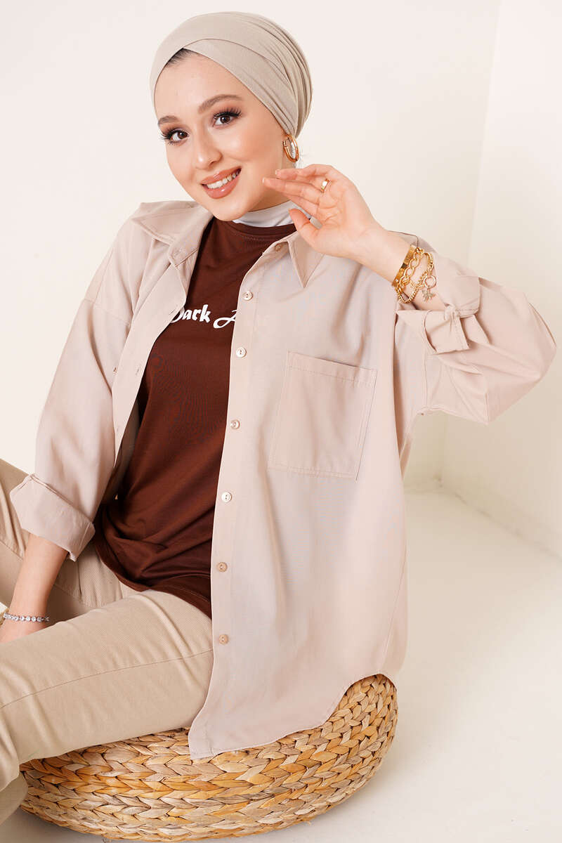 Yeni sezon gömleğimizin göğsünde iki adet cebi bulunmaktadır. Cepleri kullanılabilmektedir. Düşük omuz model olan gömeleğimizin arkası önünden uzundur. Etek ucu oval kesim olan gömeleğimizin renk çeşidi oldukça fazladır.