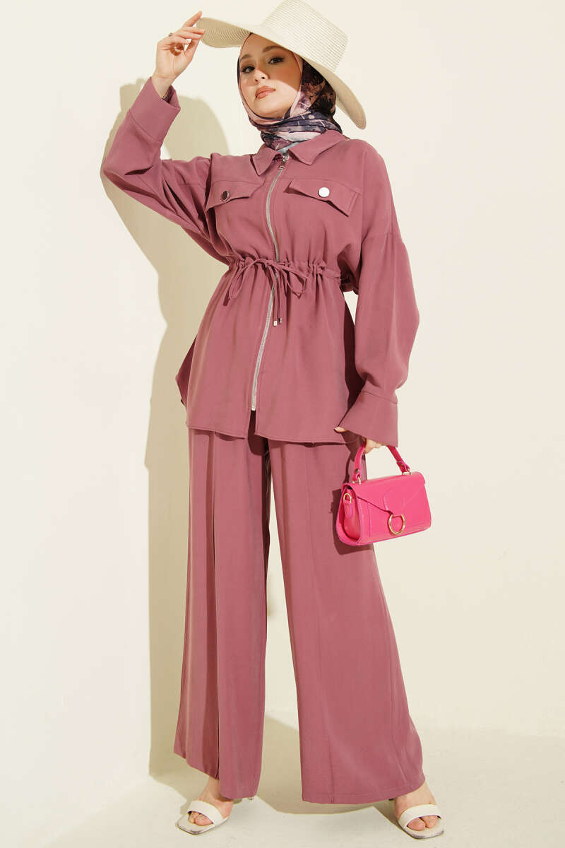 Çift Cep Kapaklı Bel Tünelli Tensel İkili Takım Latte