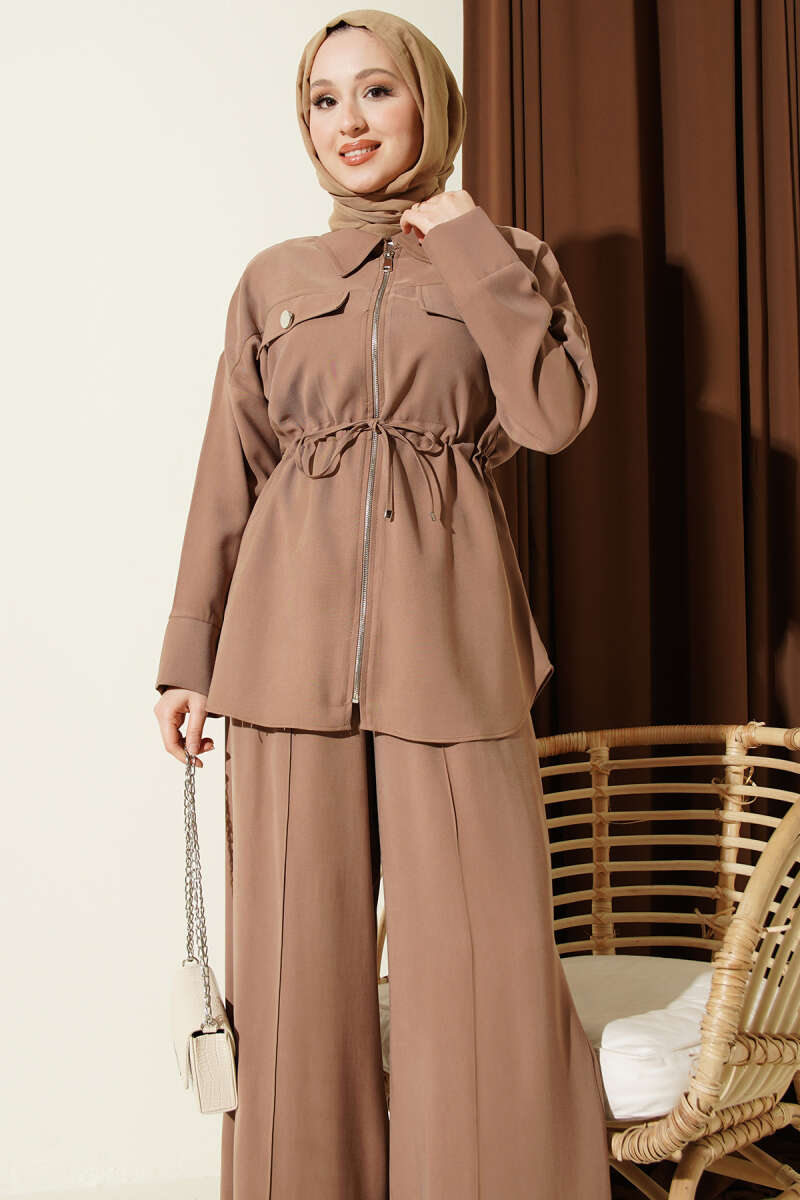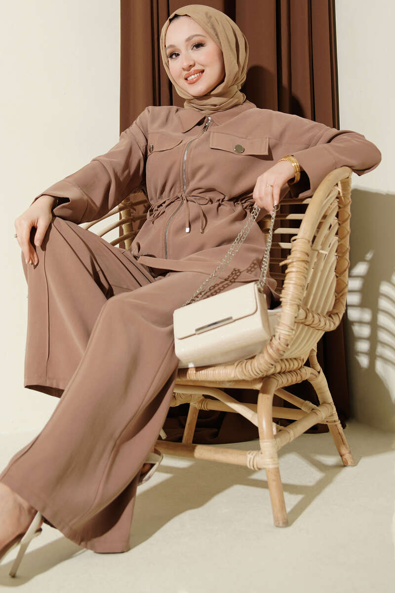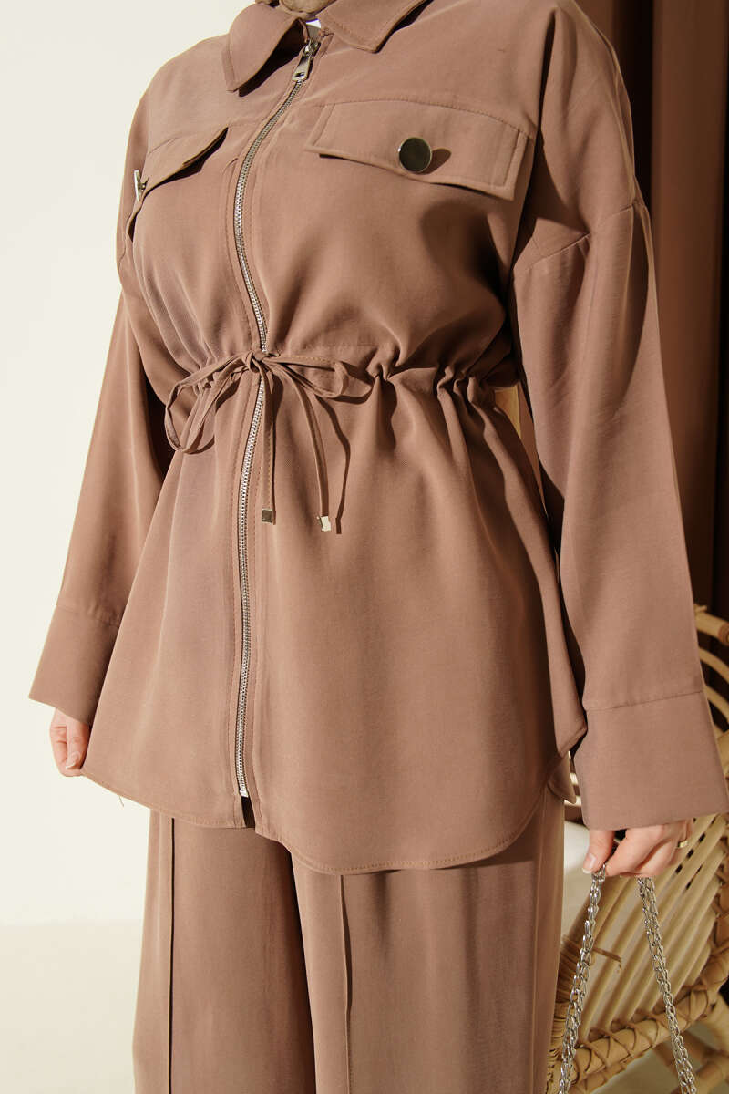 Çift Cep Kapaklı Bel Tünelli Tensel İkili Takım Latte