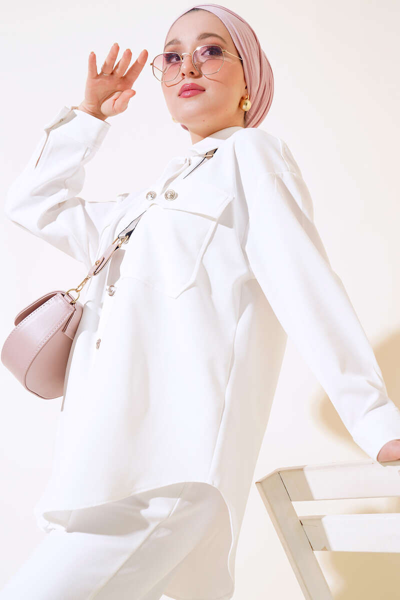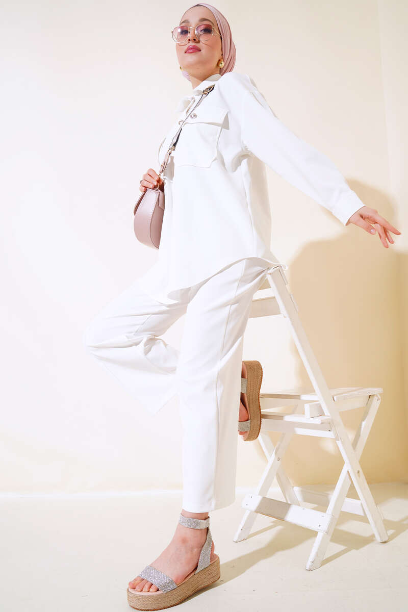 Çift Cep Kapaklı İkili Takım Ekru