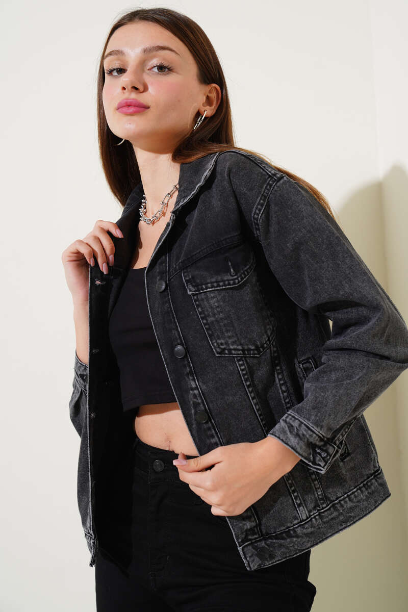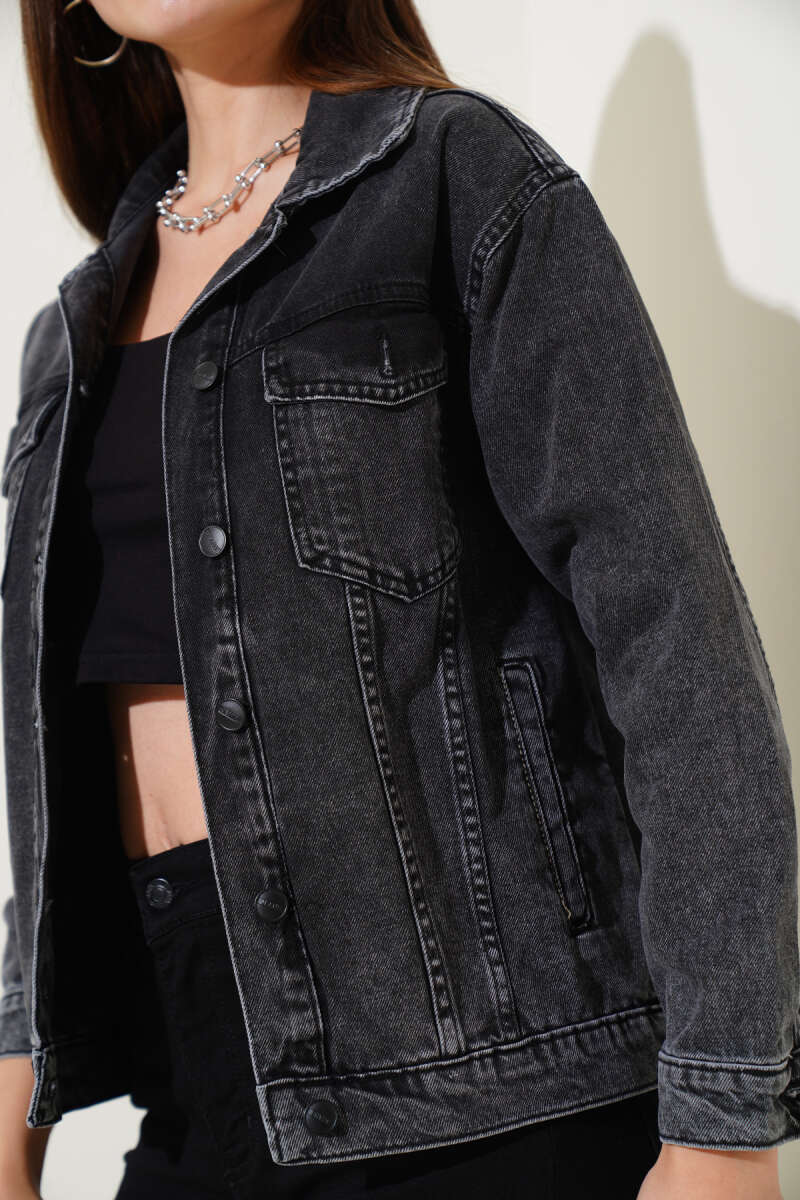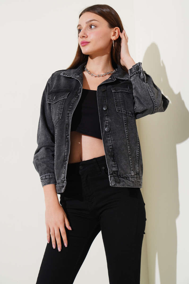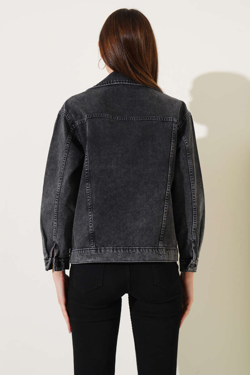 Düğmeli Gömlek Yaka Keçe Ceket Siyah