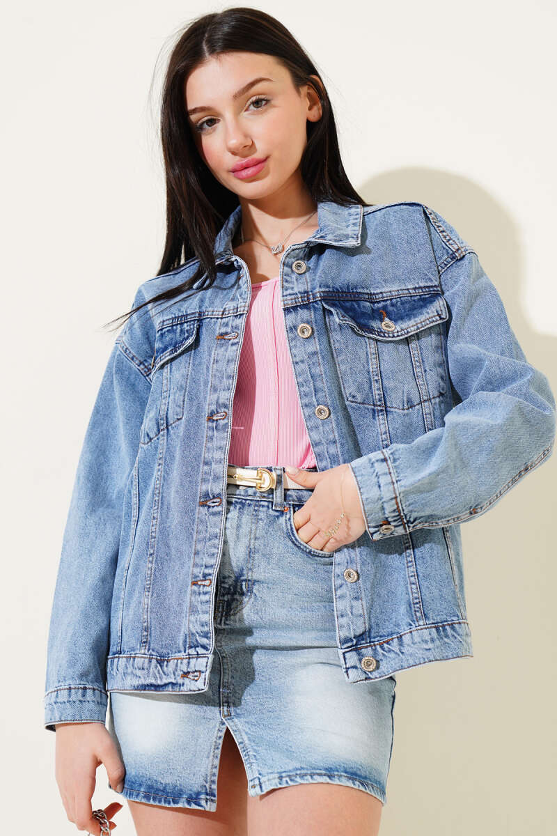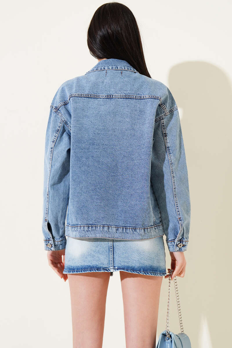 Çift Cep Kapaklı Kısa Kot Ceket Mavi