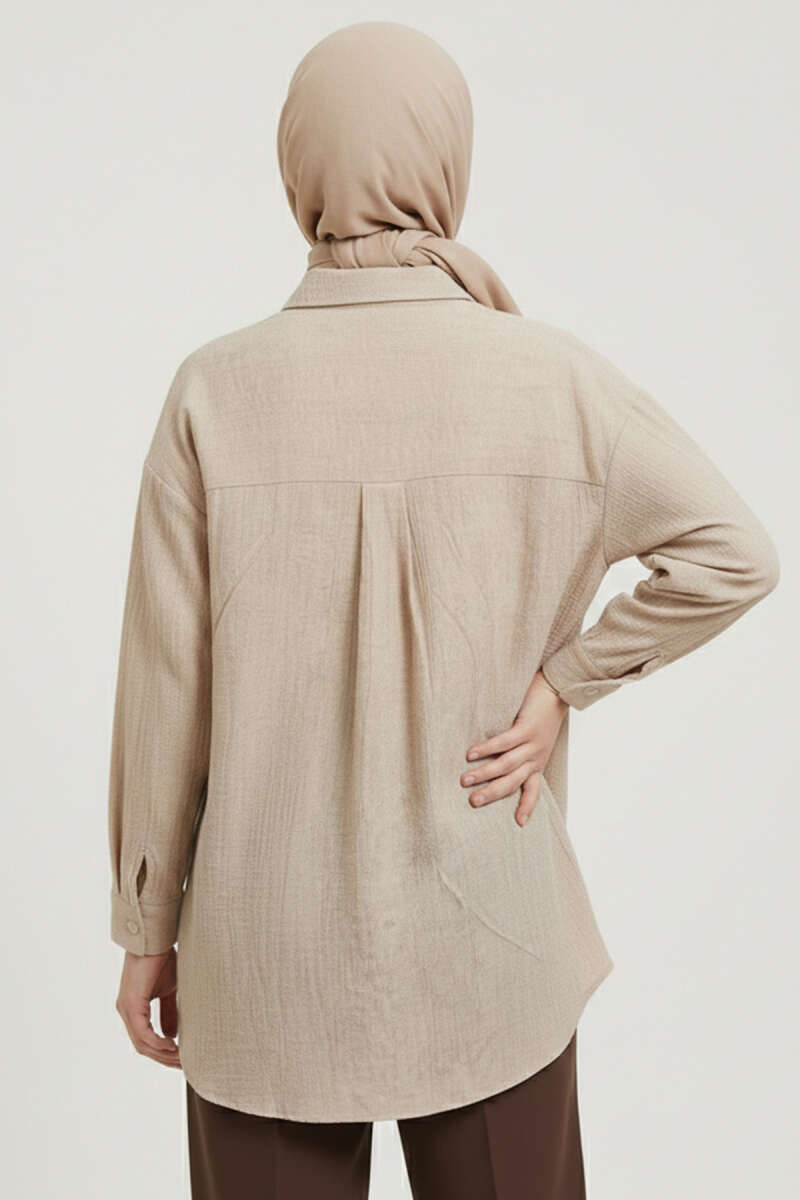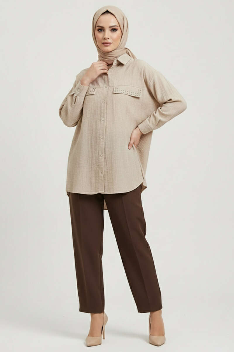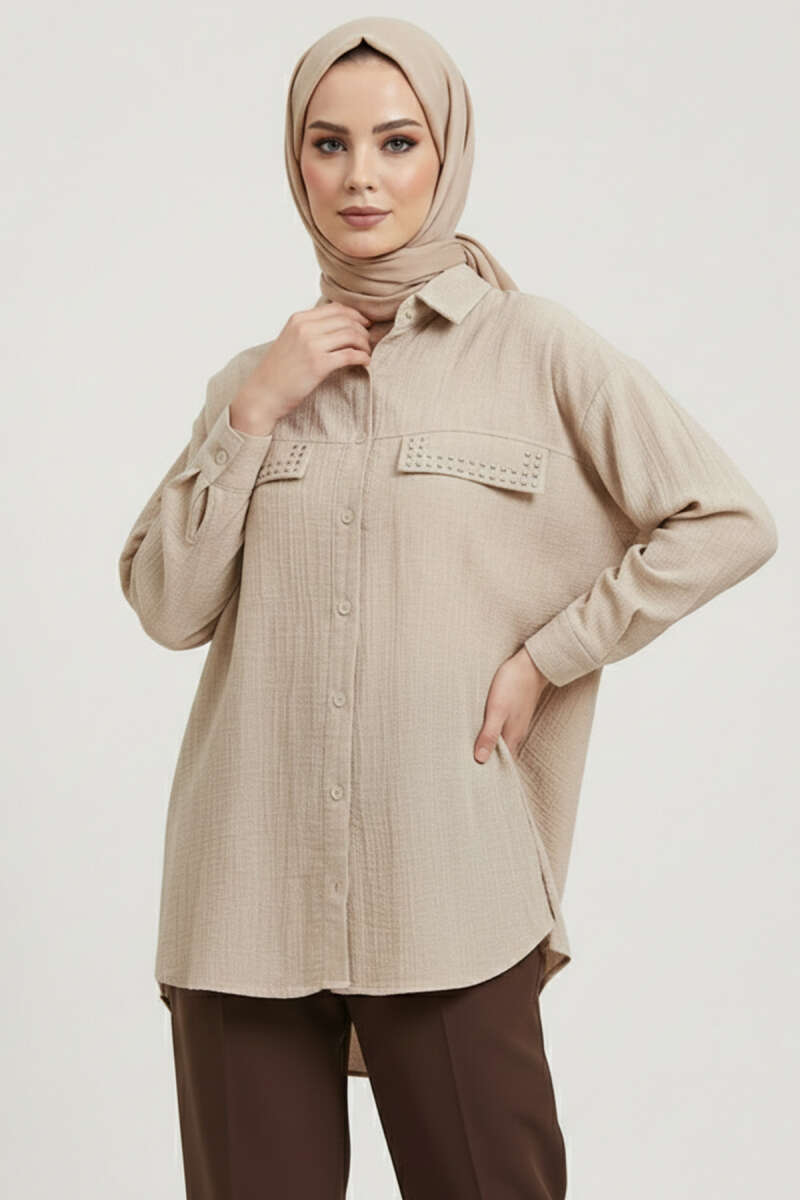Çift Cep Kapaklı Zımbalı Tunik Bej