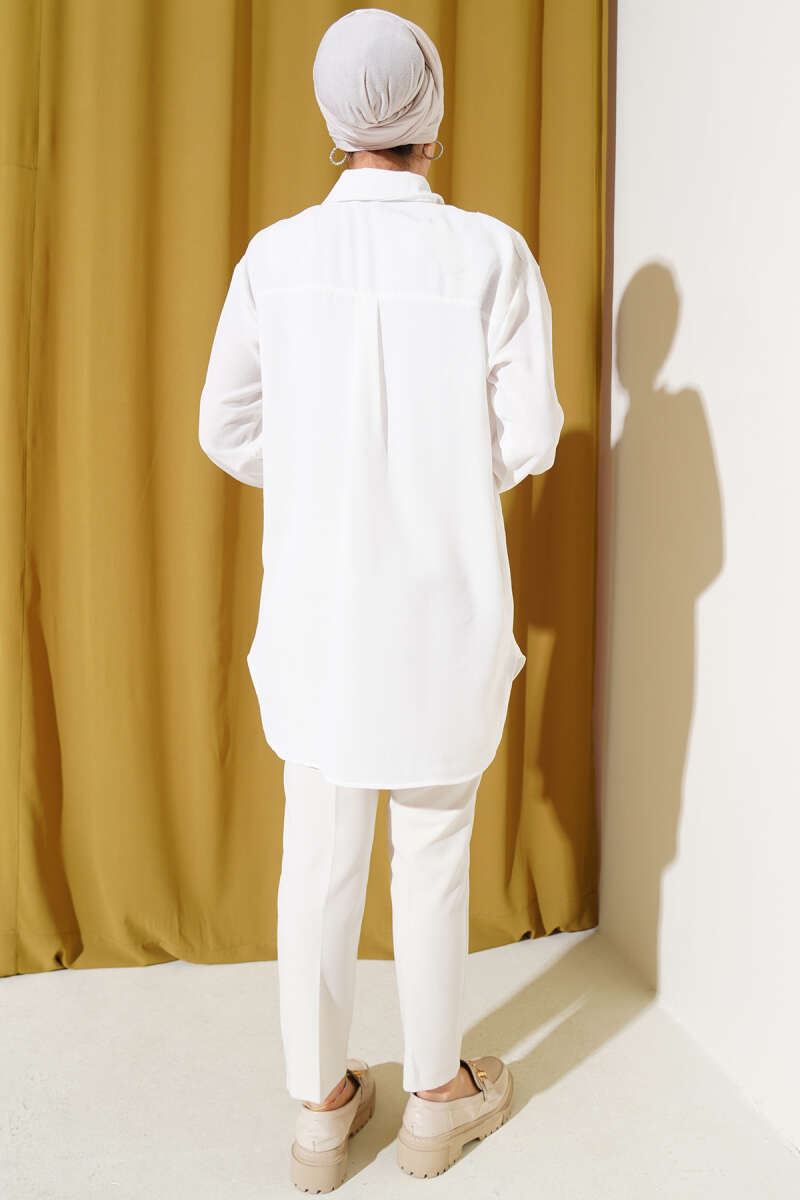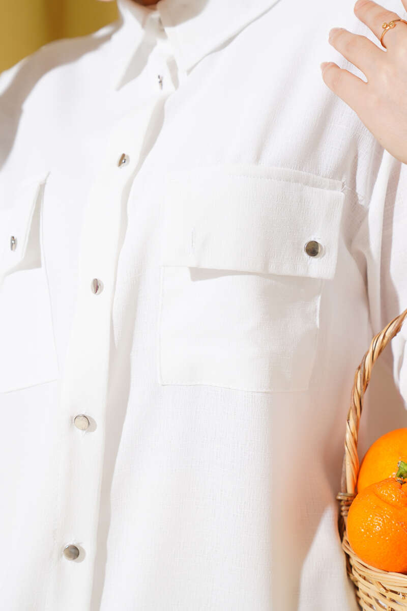 Gizli Düğmeli Bel Kuşaklı Gömlek Beyaz