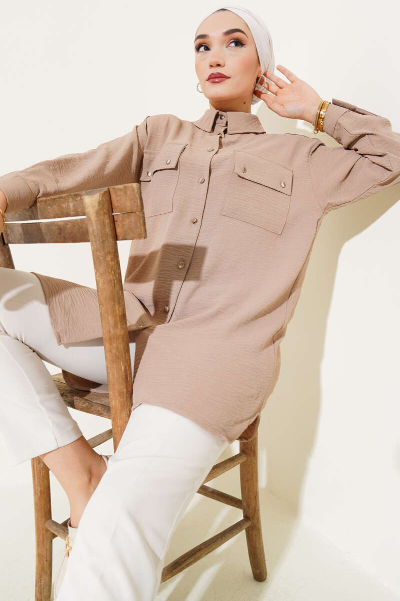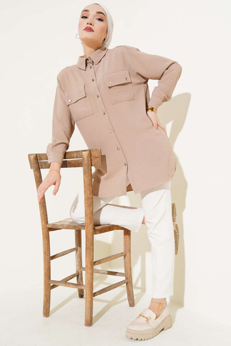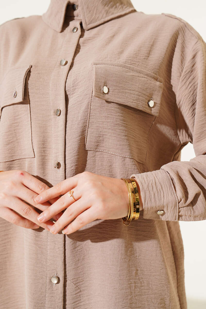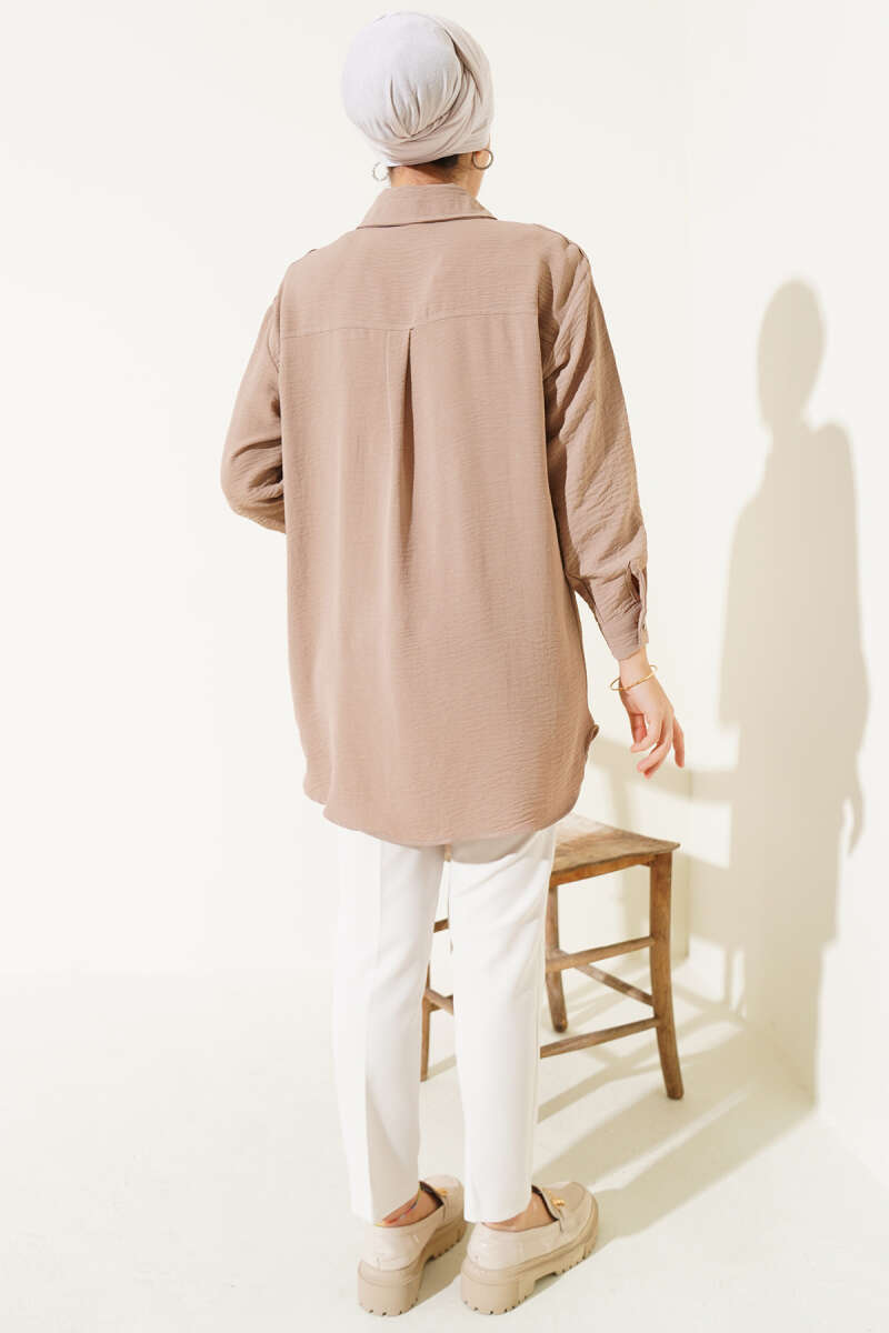 Taş Düğmeli Omuz Pileli Gömlek Bej