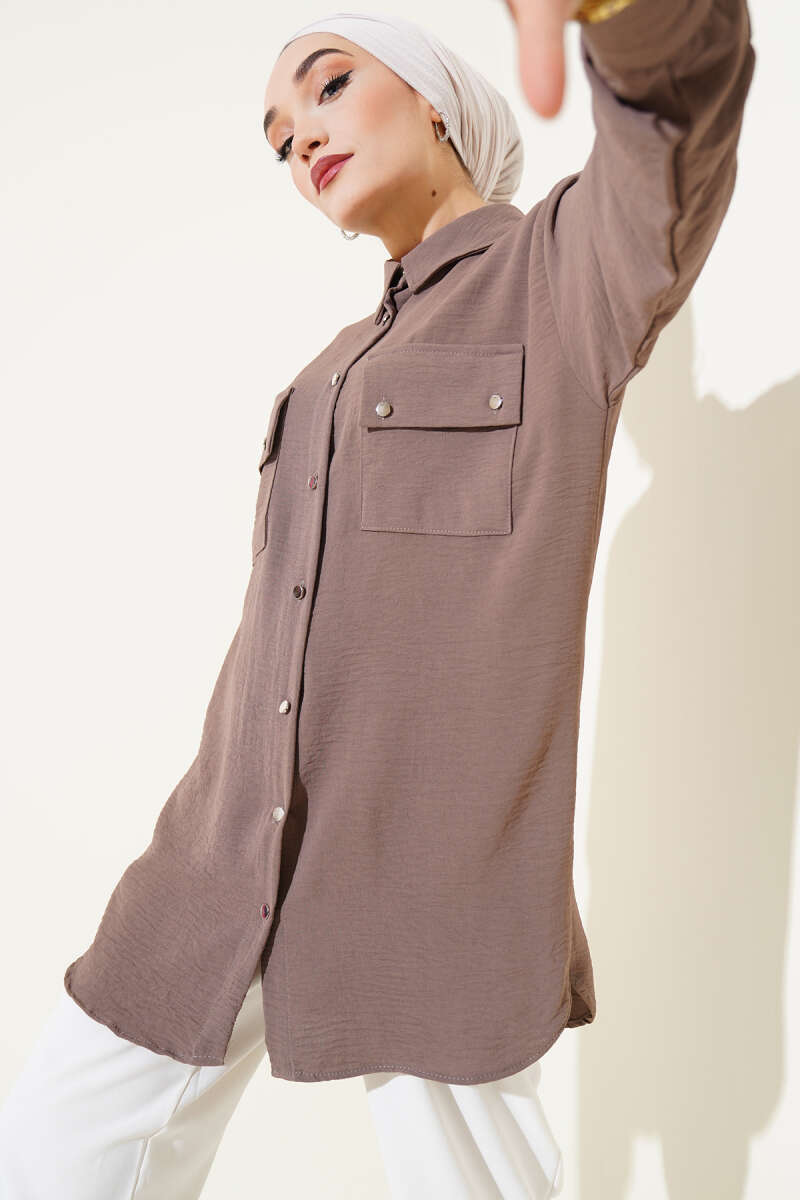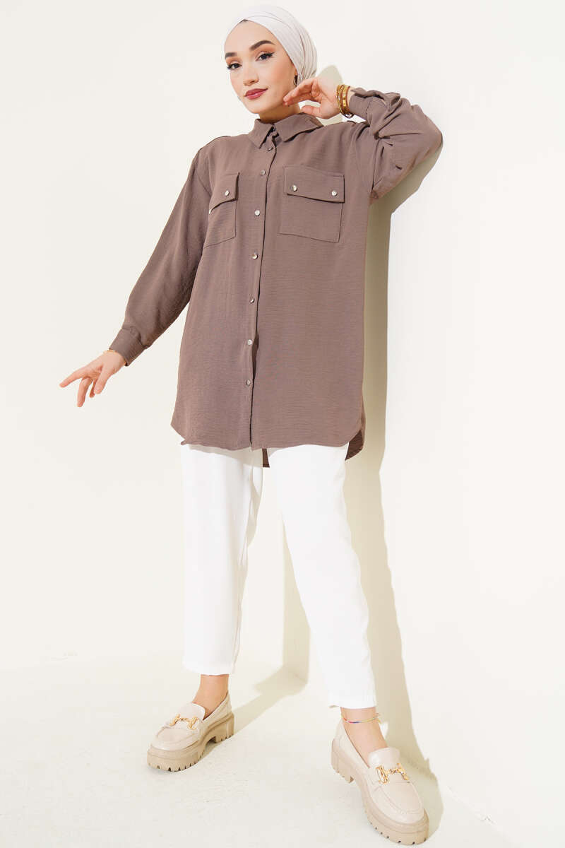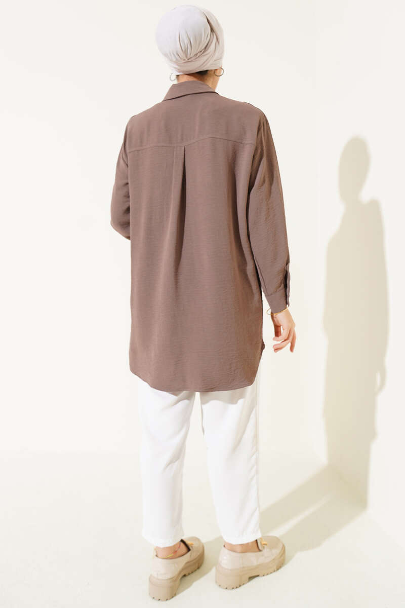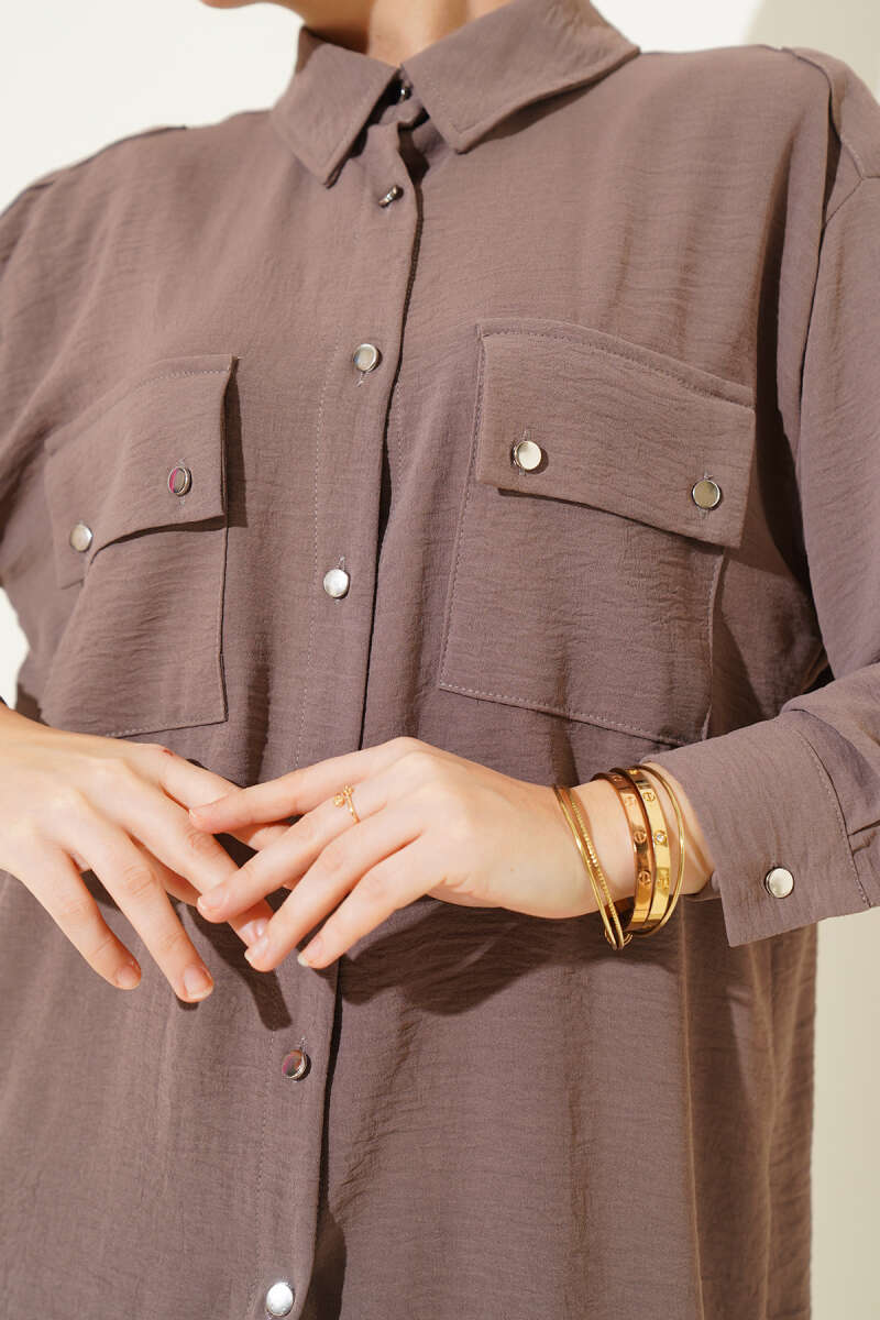 Taş Düğmeli Omuz Pileli Gömlek Kahve
