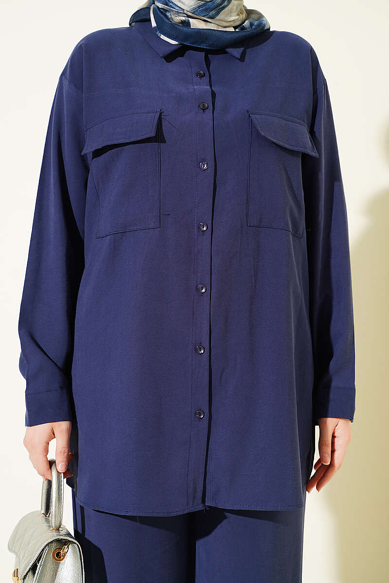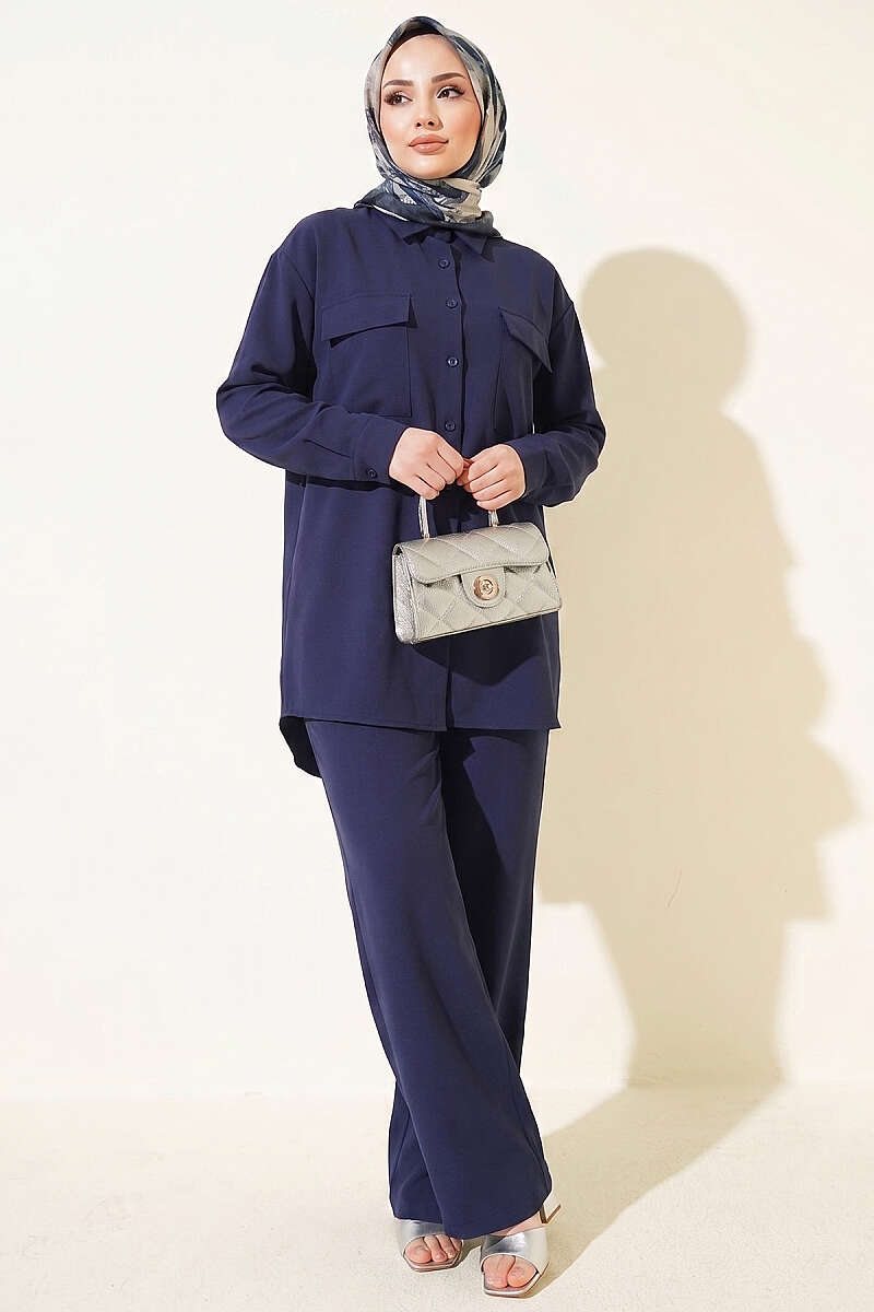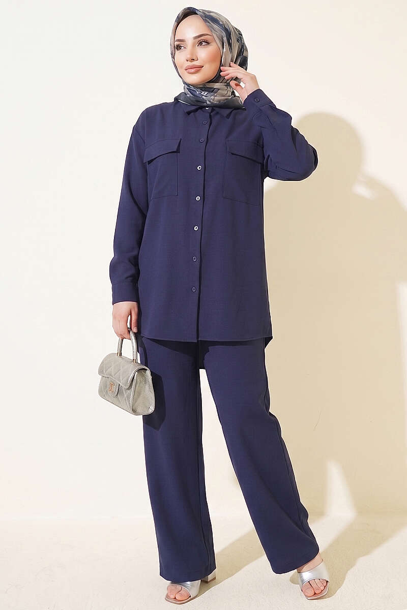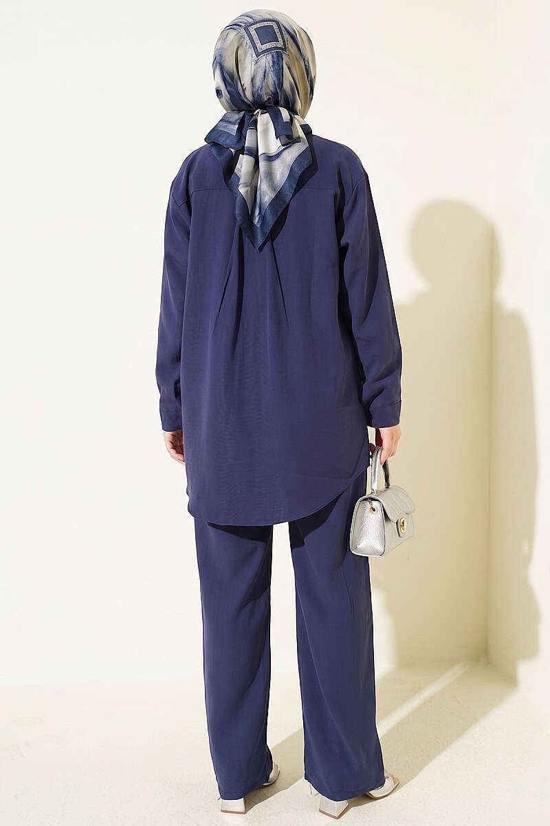 Brit Düğmeli Kuşaklı İkili Takım Lacivert